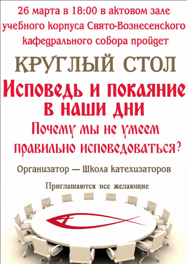 «Исповедь и покаяние в наши дни: почему мы не умеем правильно исповедоваться?». Круглый стол организованной Школой катехизаторов пройдет в актовом зале Свято-Вознесенского кафедрального собора.