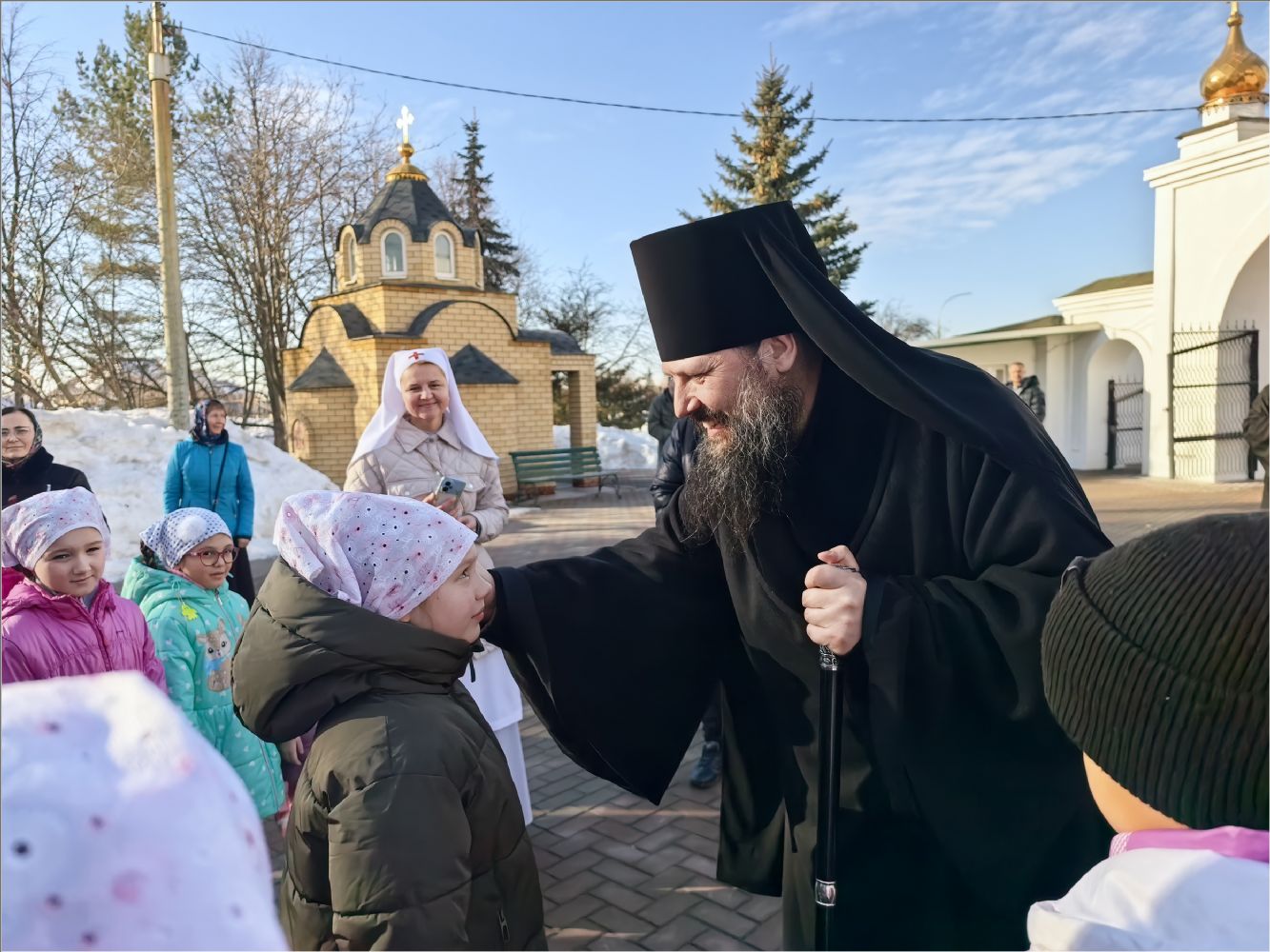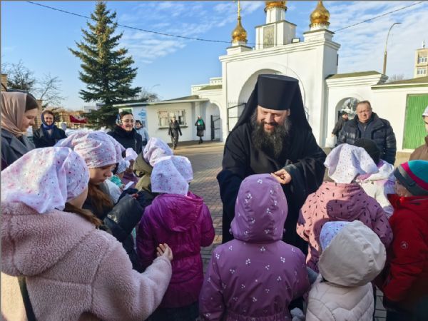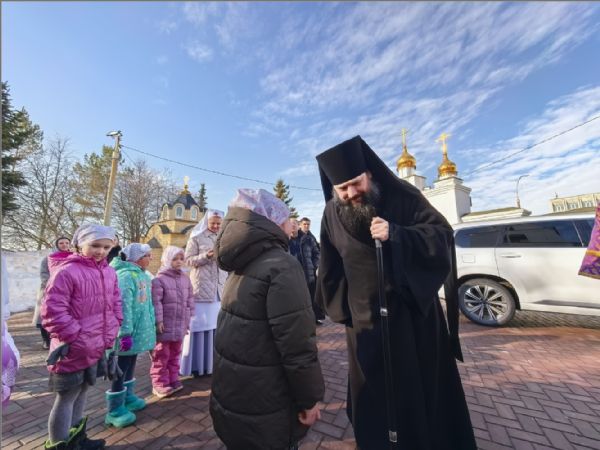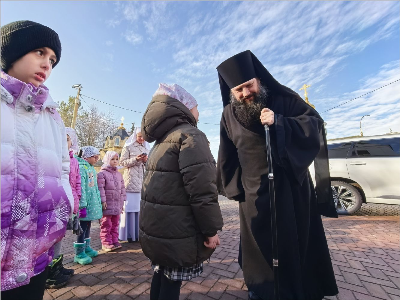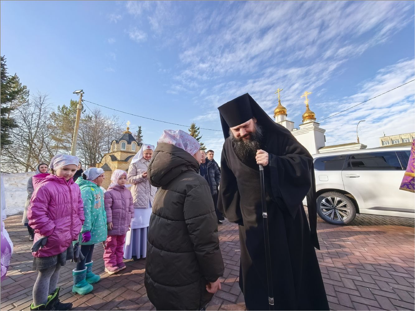 У входа в храм епископа встретили дети воскресной школы прихода. Они приветствовали владыку с детской непосредственностью и светлой верой. Архипастырь благословил их, подарил им иконы, пожелав им помощи Божией в учёбе и добрых делах, после чего вместе с юными прихожанами проследовал в храм.