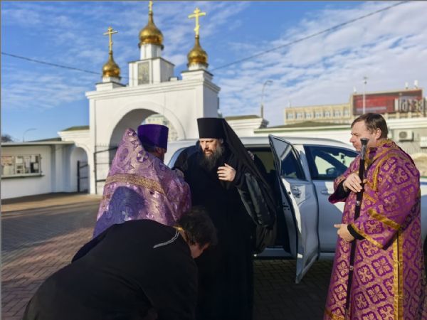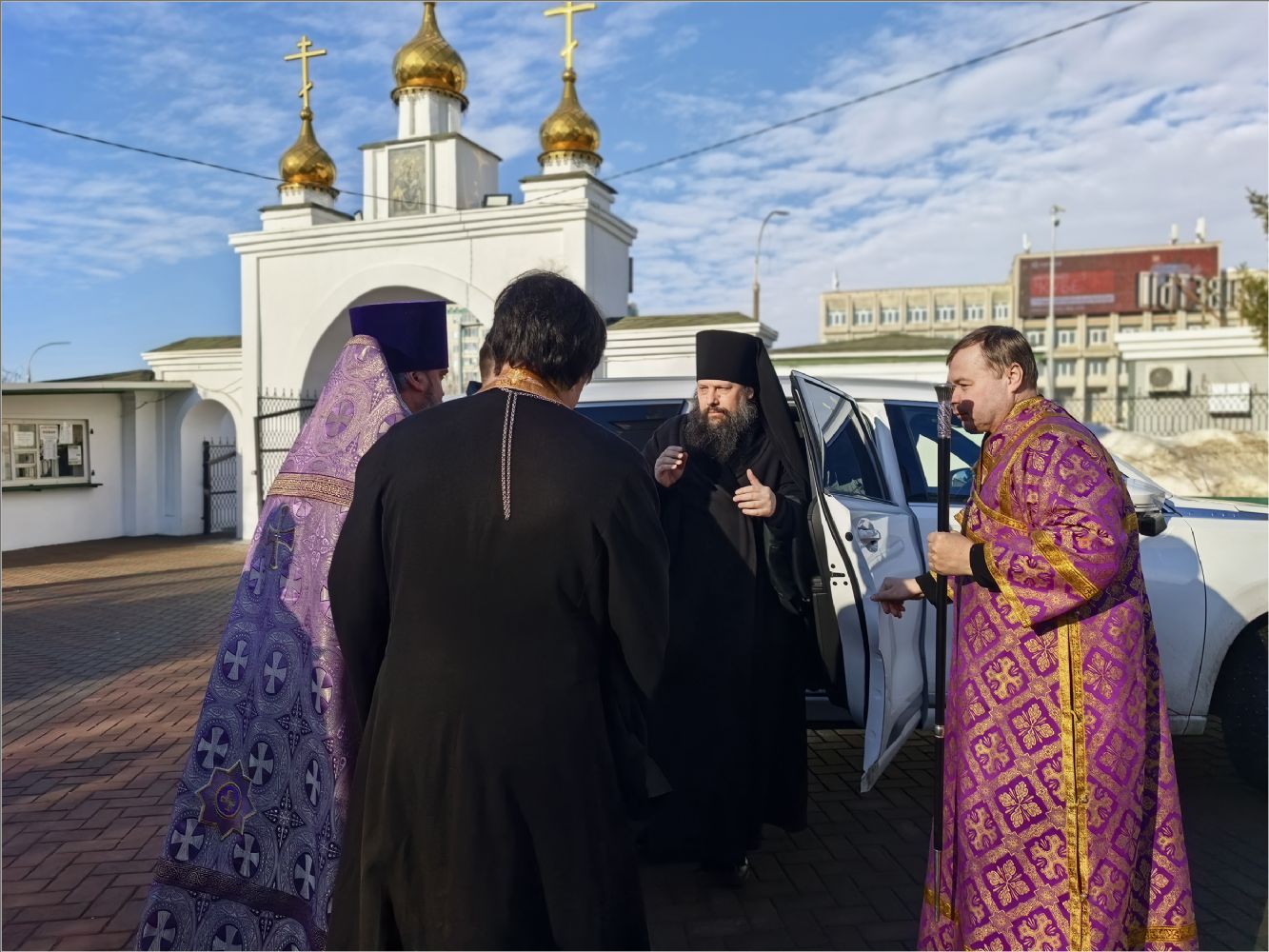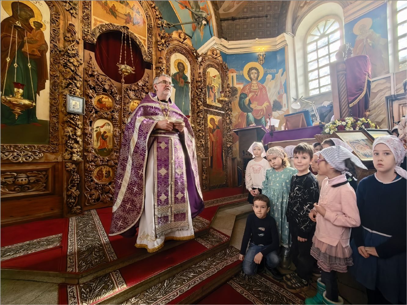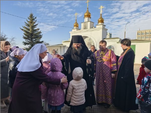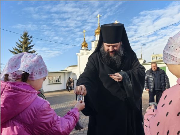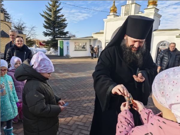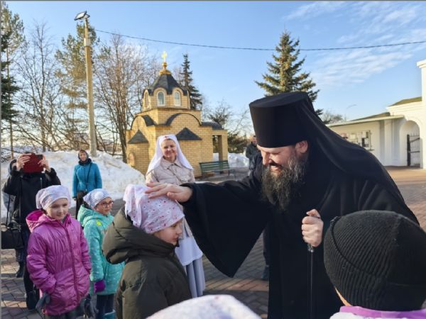 У входа в храм епископа встретили дети воскресной школы прихода. Они приветствовали владыку с детской непосредственностью и светлой верой. Архипастырь благословил их, подарил им иконы, пожелав им помощи Божией в учёбе и добрых делах, после чего вместе с юными прихожанами проследовал в храм.