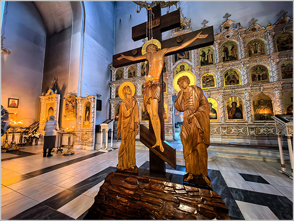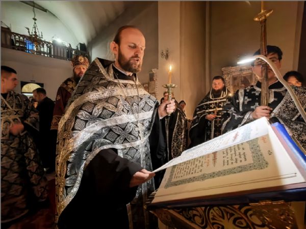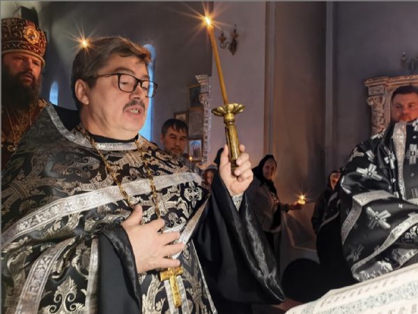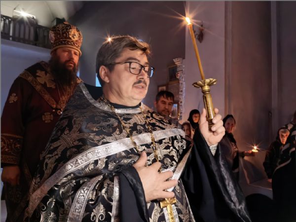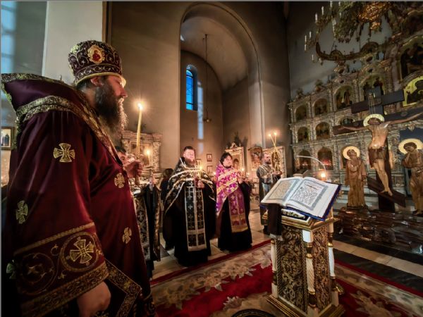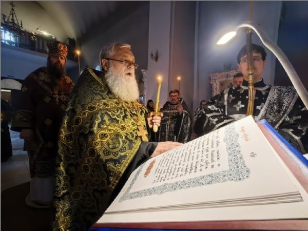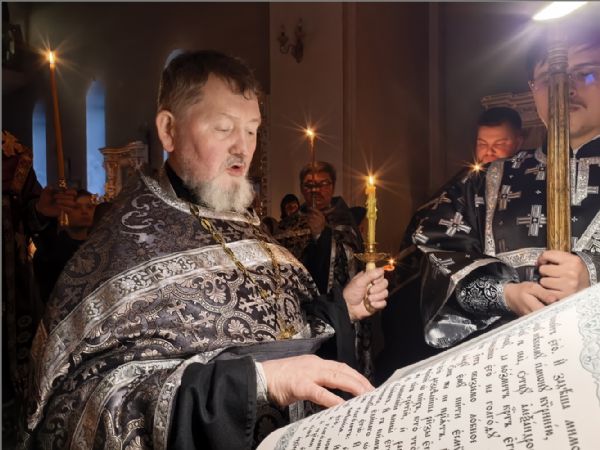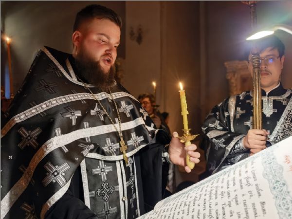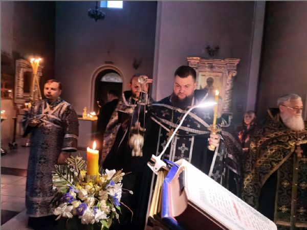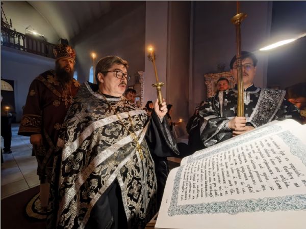 На середине храма был установлен крест с изображением Распятия Спасителя — зримый символ Искупления, напоминающий каждому верующему о жертвенной любви Божией. Владыка и священнослужители поочередно читали отрывки из Евангелия, повествующие о спасительных Страданиях Господа. В этих священных текстах перед собравшимися прошли важнейшие вехи пути Спасителя: от Сионской горницы до Гефсиманского сада, от предательства Иуды до отречения Петра, от суда у первосвященника Каиафы до приговора Понтия Пилата, а затем — крестный путь на Голгофу. Множество верующих пришли в этот день в храм, чтобы в молитвенном единении пройти вместе со своим Спасителем через эти судьбоносные события, углубить своё понимание искупительного подвига Христа и прикоснуться сердцем к тайне Божественной любви, явленной в Страданиях и Крестной смерти.