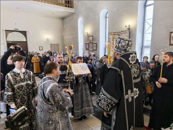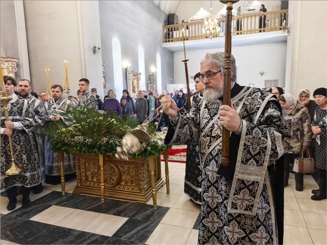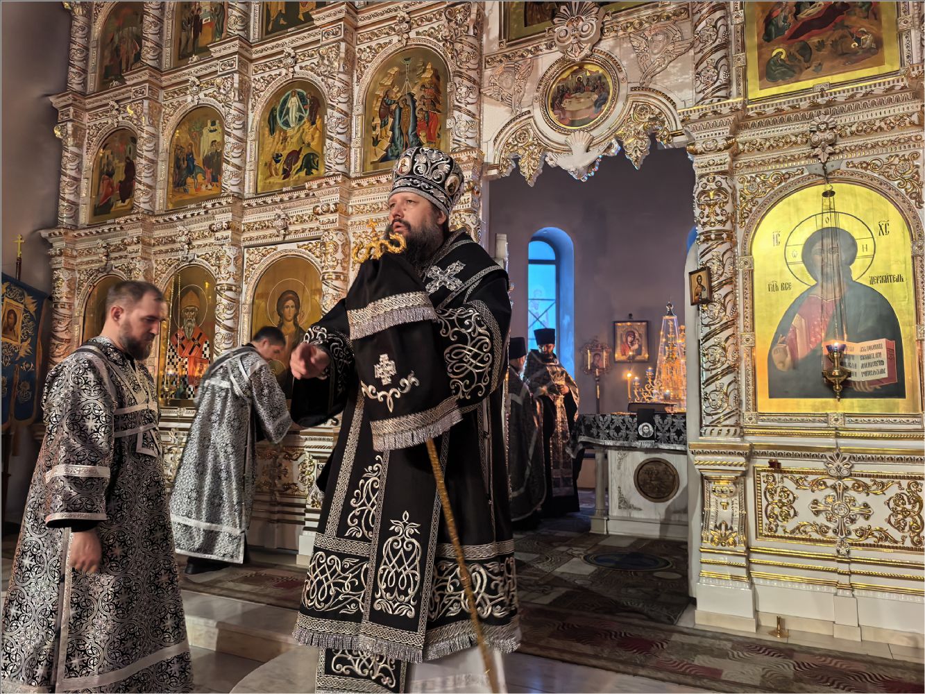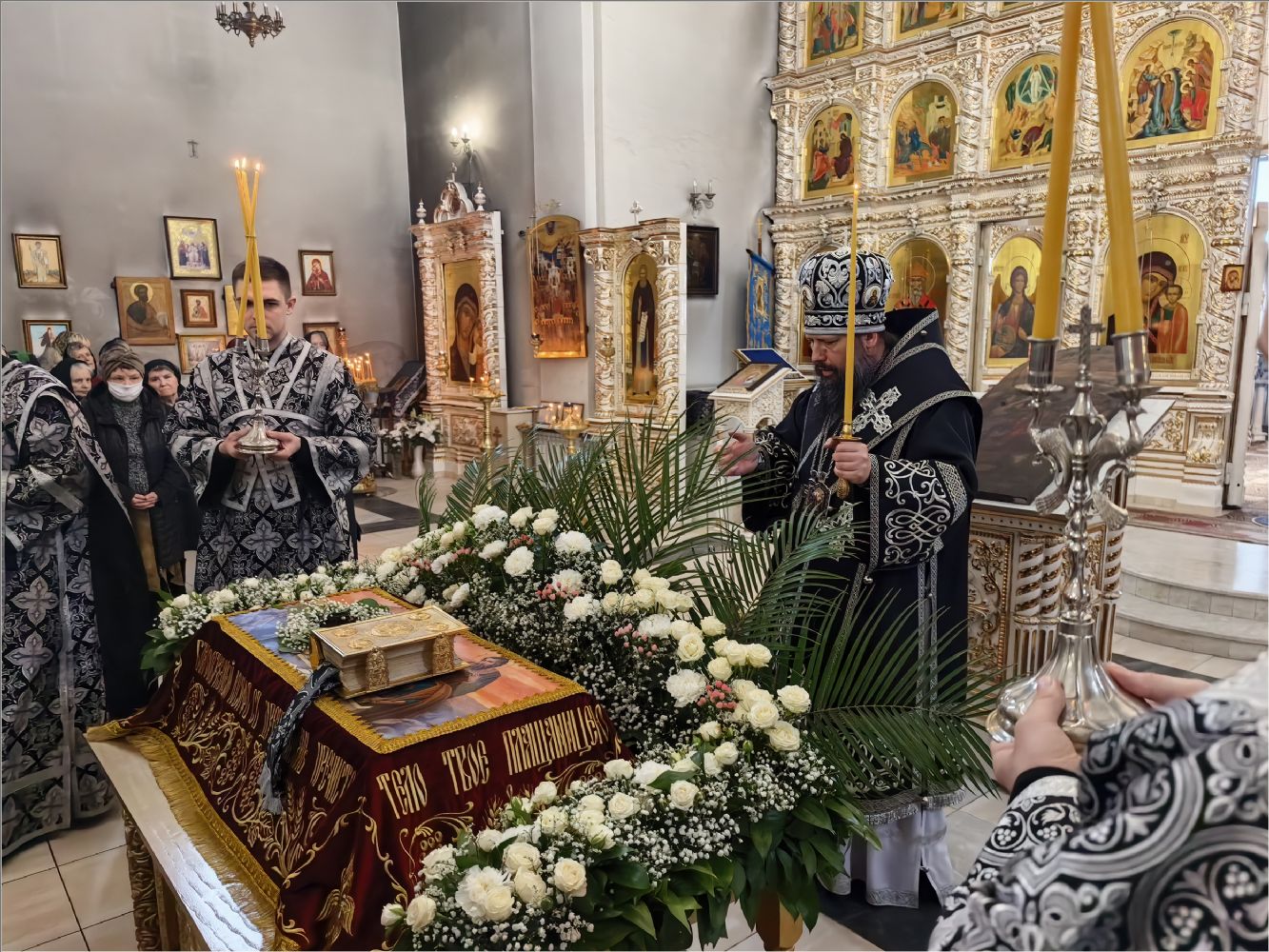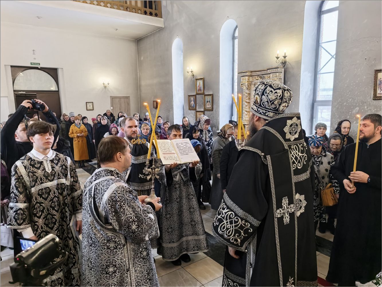 10 апреля 2026 года, в пятницу Страстной Седмицы — день воспоминаний Святых спасительных Страстей Господа нашего Иисуса Христа, епископ Набережночелнинский и Елабужский Гавриил совершил вечерню с чином выноса Святой Плащаницы в храме Казанской иконы Божией Матери города Набережные Челны.