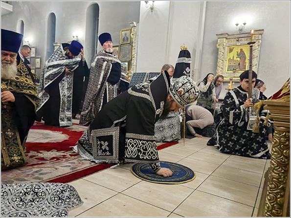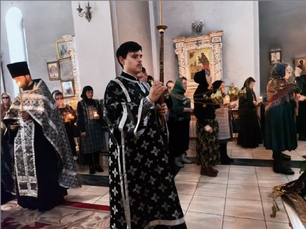 На вечерне было прочитано составное Евангелие, где последовательно излагаются события от суда Пилата до погребения Христа. Во время пения тропаря «Благообразный Иосиф…» Святая Плащаница была изнесена духовенством из алтаря на середину храма. Затем был пропет канон Триоди «О распятии Господни и на плач Пресвятыя Богородицы».