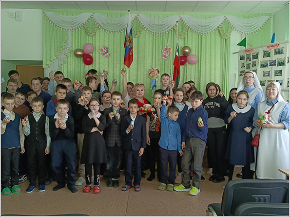 А в день Светлого Христова Воскресения воспитанники детского дома посетили один из старинных соборов купеческого города Елабуги, освященного в честь Спаса Нерукотворного Образа, в котором ребят радушно и с сердечной теплотой встретили сестры Елабужского Свято-Елизаветинского общества милосердия. Ребят ждал не только праздничный крестный ход, но и дружеское чаепитие с прихожанами храма, после чего каждый воспитанник получил вкусный ароматный кулич.