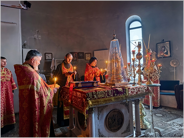 На Литургии на мирной и сугубой ектениях были вознесены молитвы о Российском воинстве и о мире. Проповедь по запричастном стихе произнес иерей Алексий Носов.