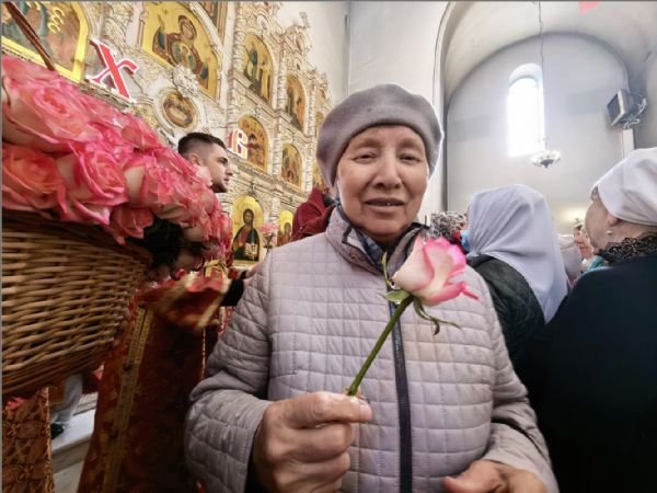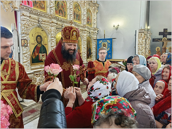 В знак почитания подвига святых жён‑мироносиц владыка вручил каждой прихожанке храма цветок — как символ духовной красоты, верности и любви к Господу, которые явили миру эти святые женщины.