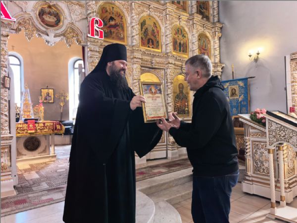 Затем епископ Гавриил наградил генерального директора компании «Татмашстрой» Валерия Пескова благодарственным письмом за содействие в строительстве временного Свято-Воскресенского храма в Набережных Челнах.