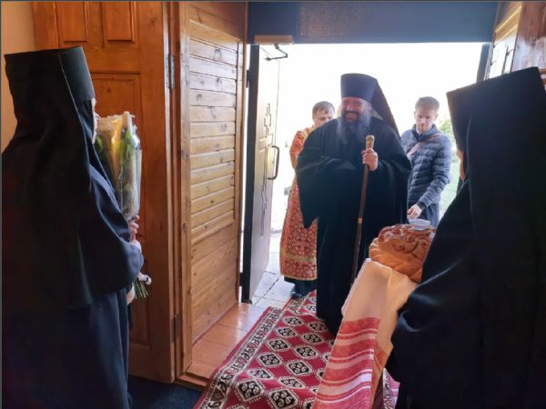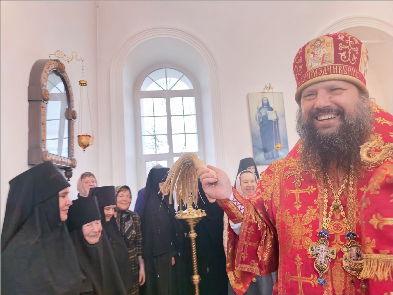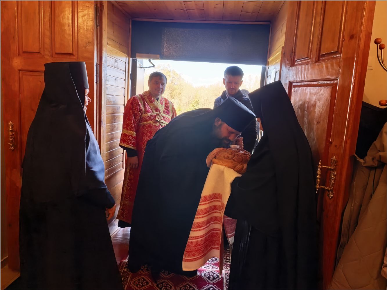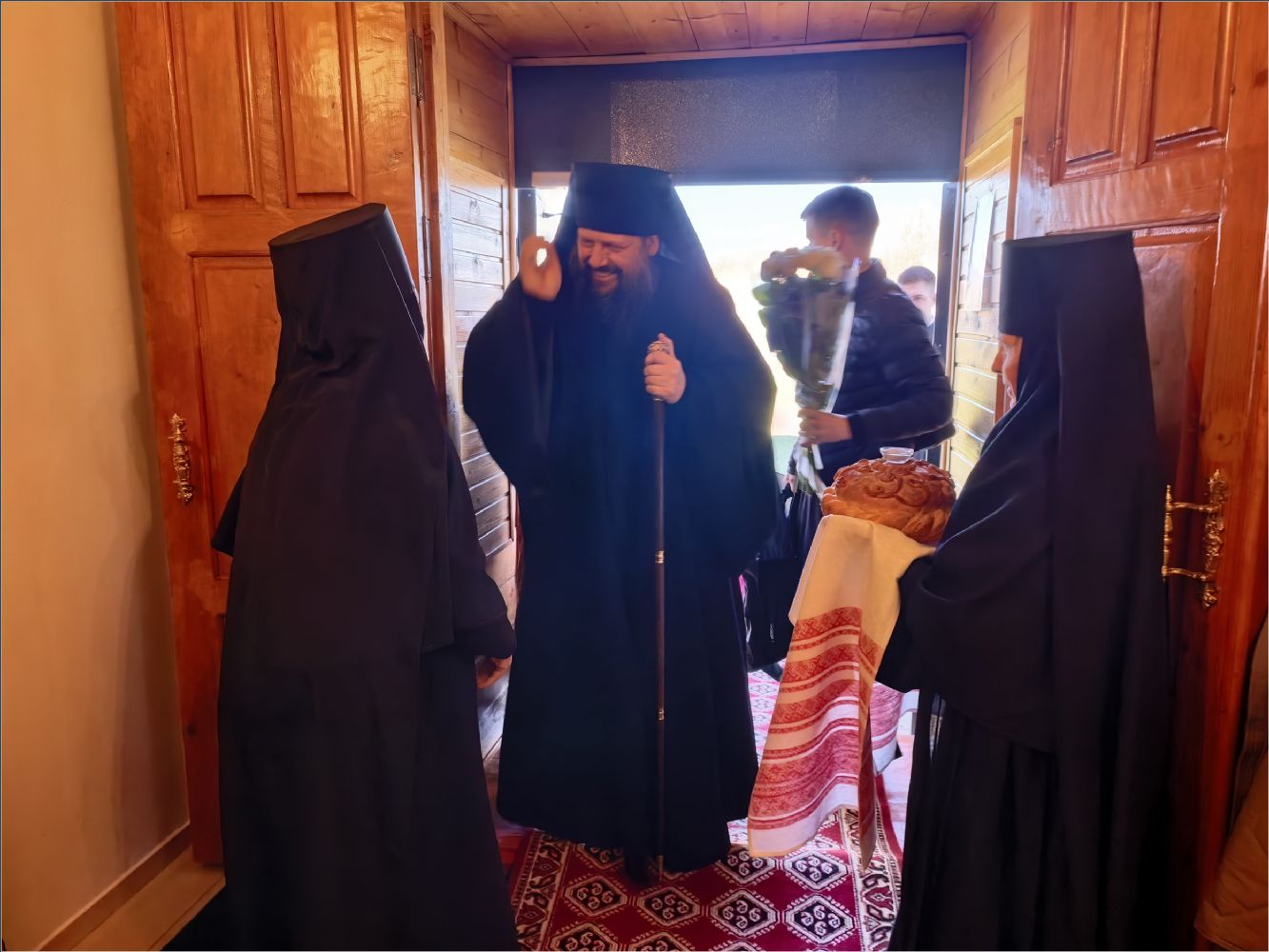«Дорогие сёстры, прежде всего — дорогая матушка, сёстры обители, наши труженики и все, кто любит Господа и служит Ему. Сегодня мы собрались в этом тихом, поистине отшельническом скиту — месте, где особенно ощущается дух уединения и молитвы. И весьма уместно, что именно сегодня, в день памяти преподобных Зосимы Соловецкого и Александра Свирского, мы совершаем здесь богослужение. Это даёт нам возможность хоть немного почувствовать себя на месте этих великих подвижников, проникнуться их духовным опытом.