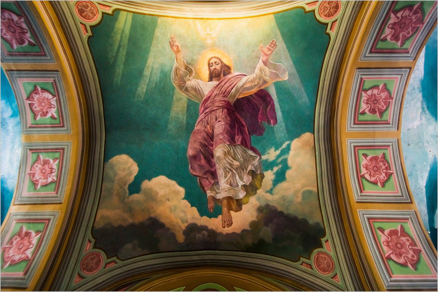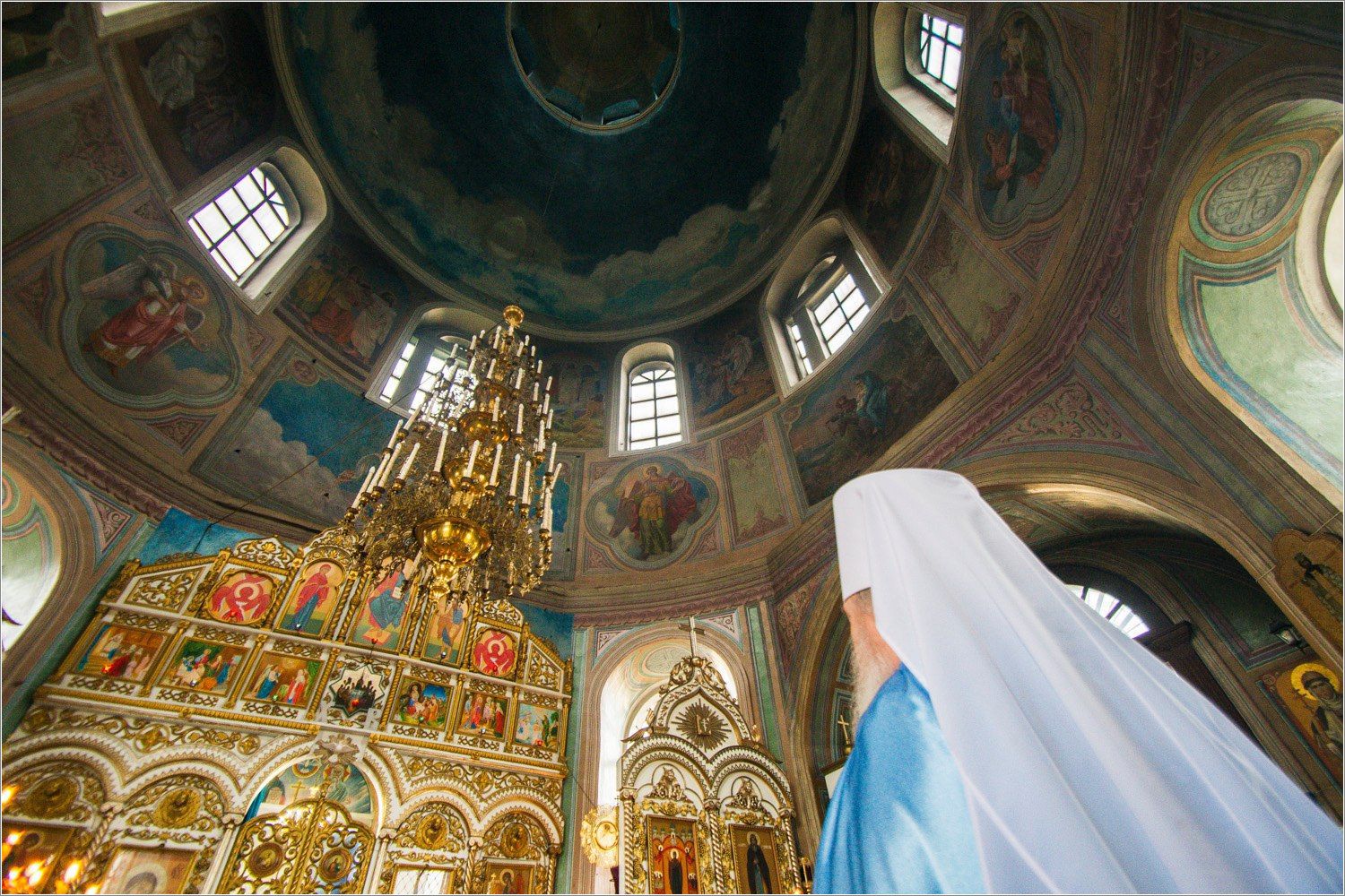 При восстановлении здания одной из главных задач было сохранение старых росписей в верхней части барабана, где были обнаружены росписи К.Ф. Гуна и В.П. Верещагина. Их восстановлением занимался петербургский художник, заведующий художественной мастерской Юрий Владимирович Пугачёв вместе с ассистентом Александром Владимировичем Батановым. Реставраторы обнаружили, что до Гуна и Верещагина стены были расписаны темперой, в основном это были небольшие картины и орнамент. Гун и Верещагин работали масляными красками, в розово-оливковом и голубовато-синем колорите. При реставрации сюжеты изображений сохранили, положив сверху новый красочный слой, однако прежний колорит при этом был потерян. Казанский реставратор Михаил Яо сравнил сюжеты Гуна и Верещагина с живописью Ренессанса по мастерству исполнения, обрамлению растительным орнаментом в стиле ампир, «с тончайшим исполнением ажурной позолоты»