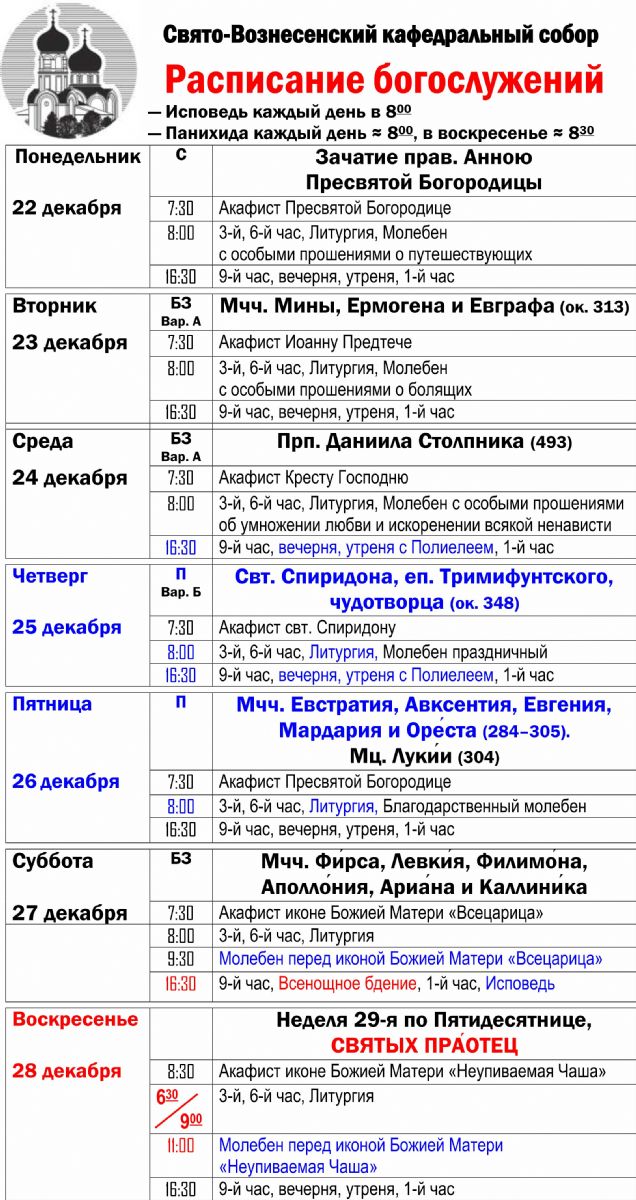 Расписание богослужений с 22 по 28 декабря 2025 года: