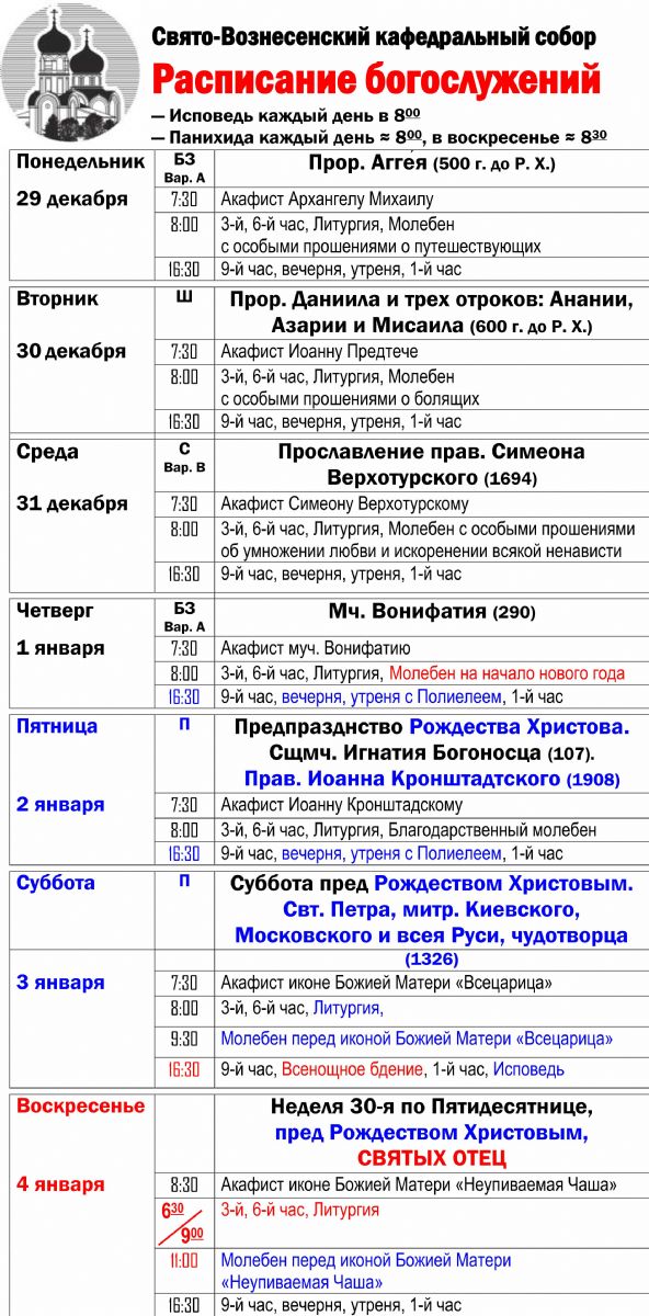 Расписание богослужений с 29 декабря 2025 года по 4 января 2026 года:
