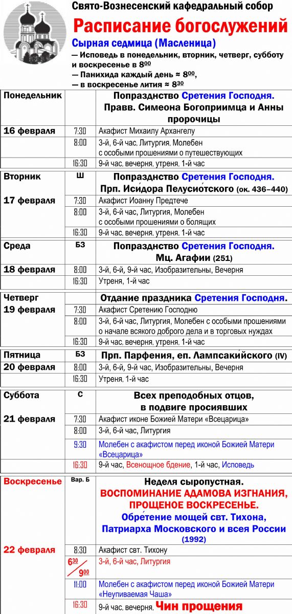 Расписание богослужений с 16 по 22 февраля 2026 года:
