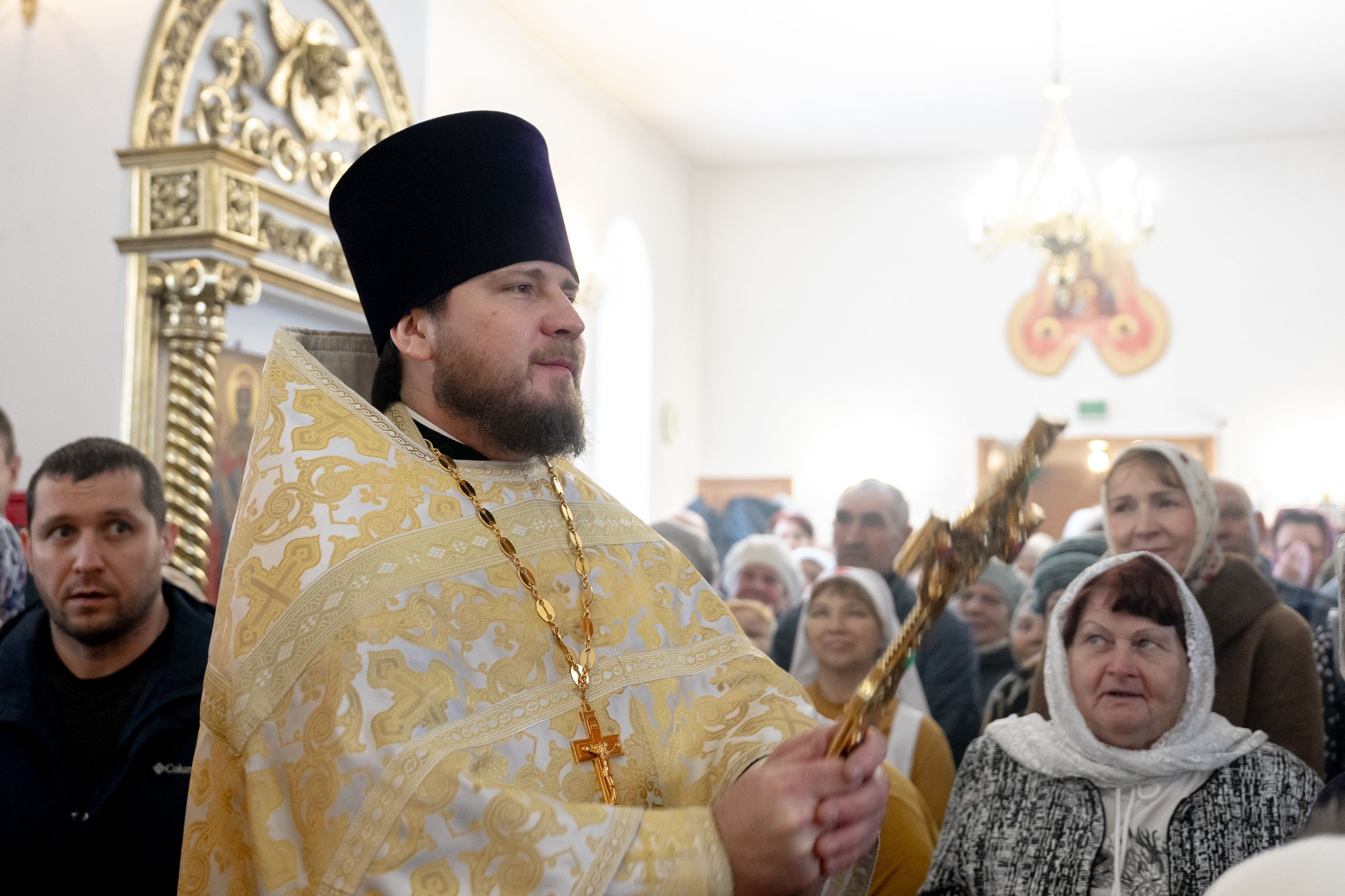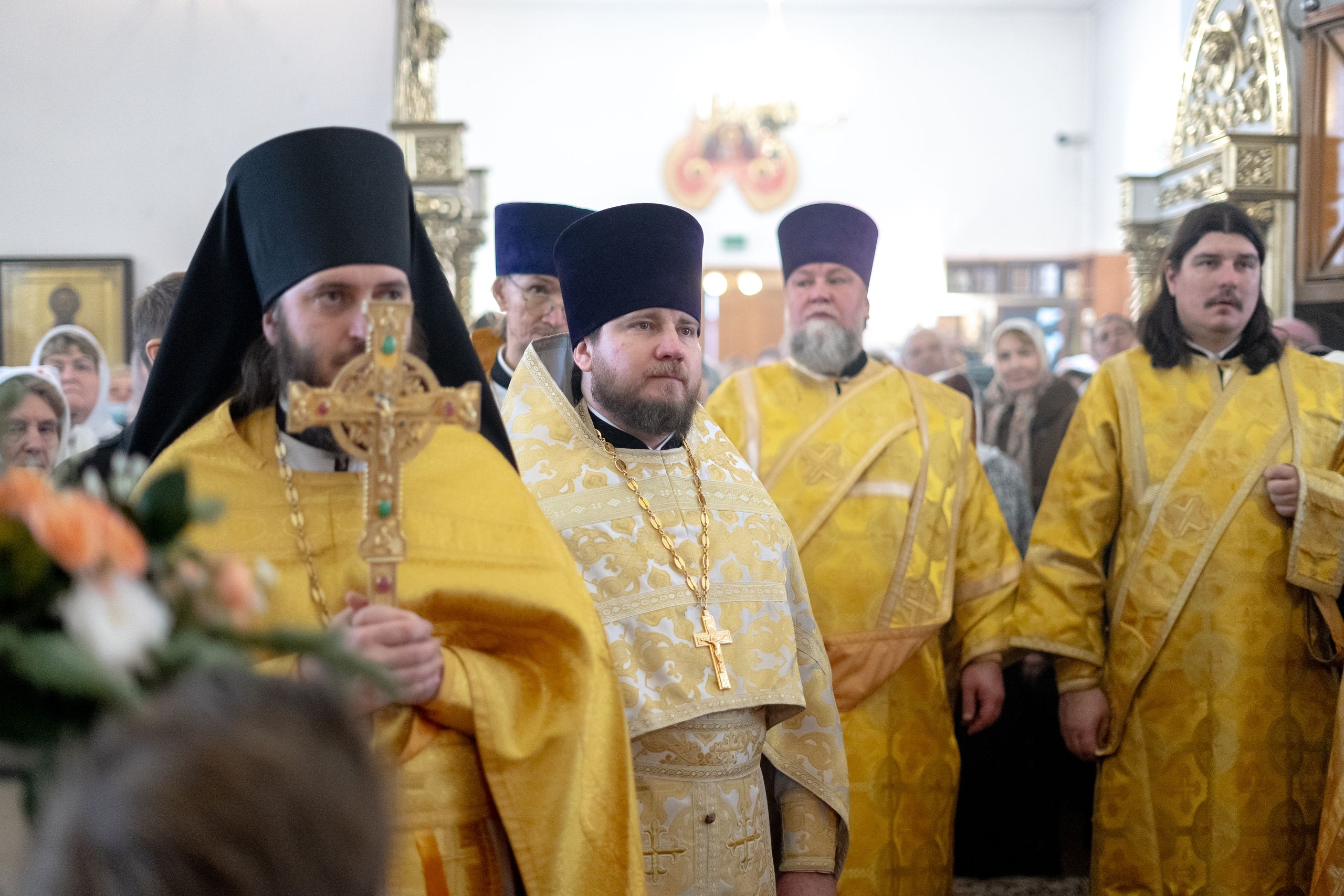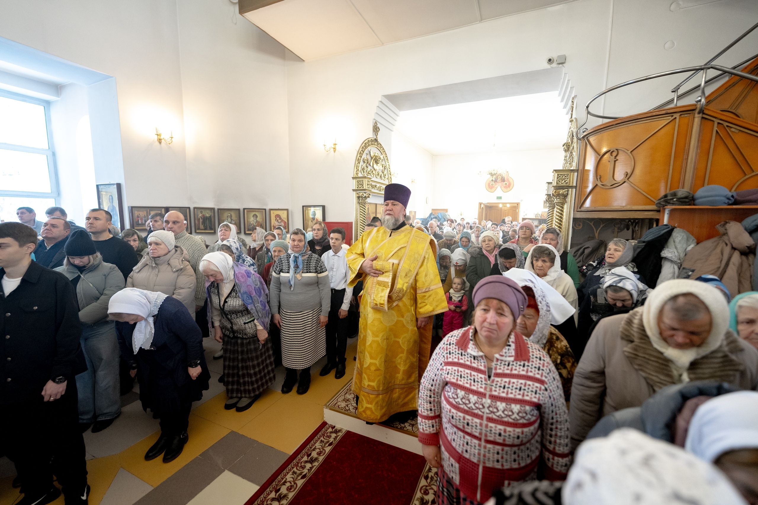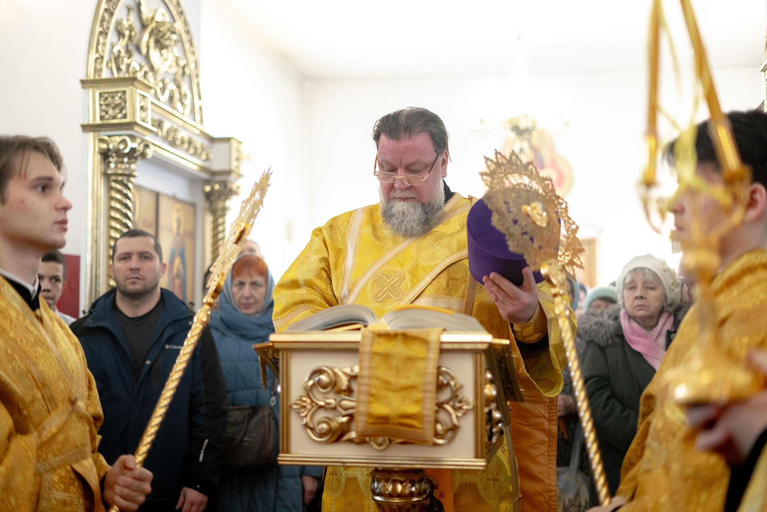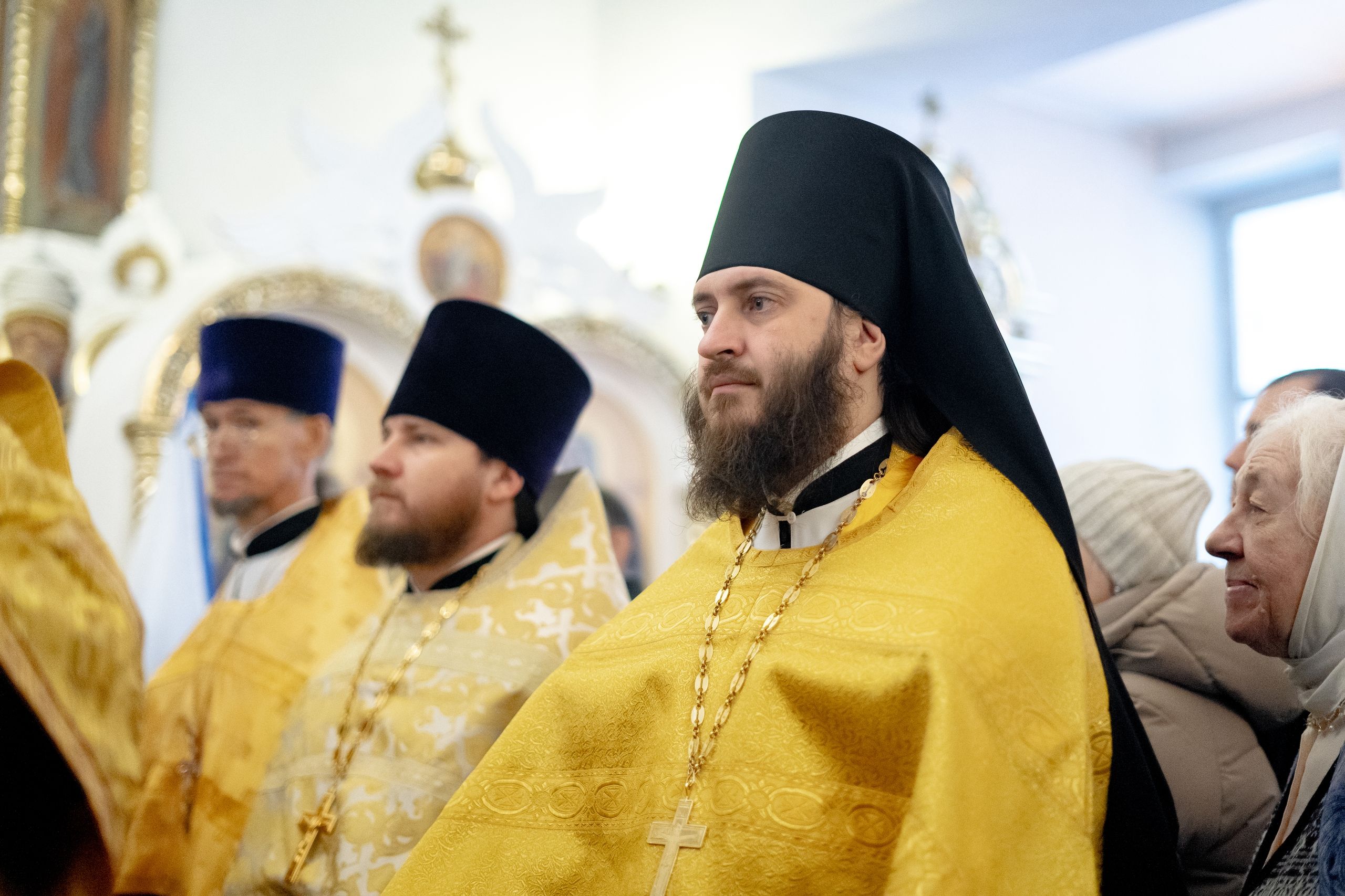 На мирной и сугубой ектениях были вознесены молитвы о Российском воинстве и о мире. По запричастном стихе проповедь произнёс игумен Пимен (Ивентьев).