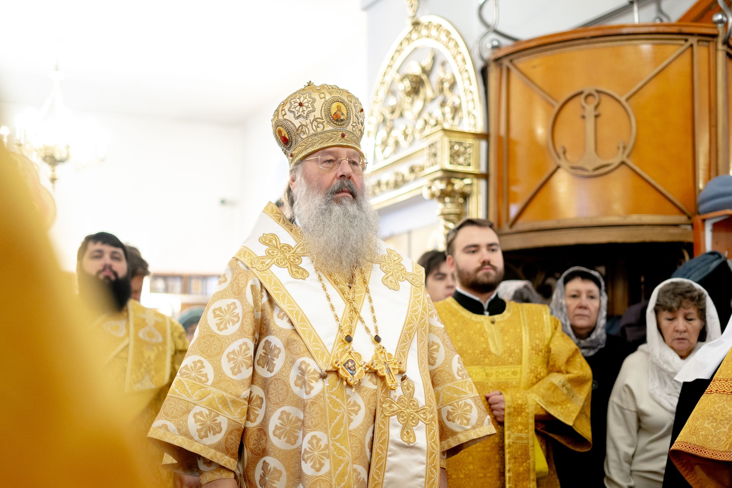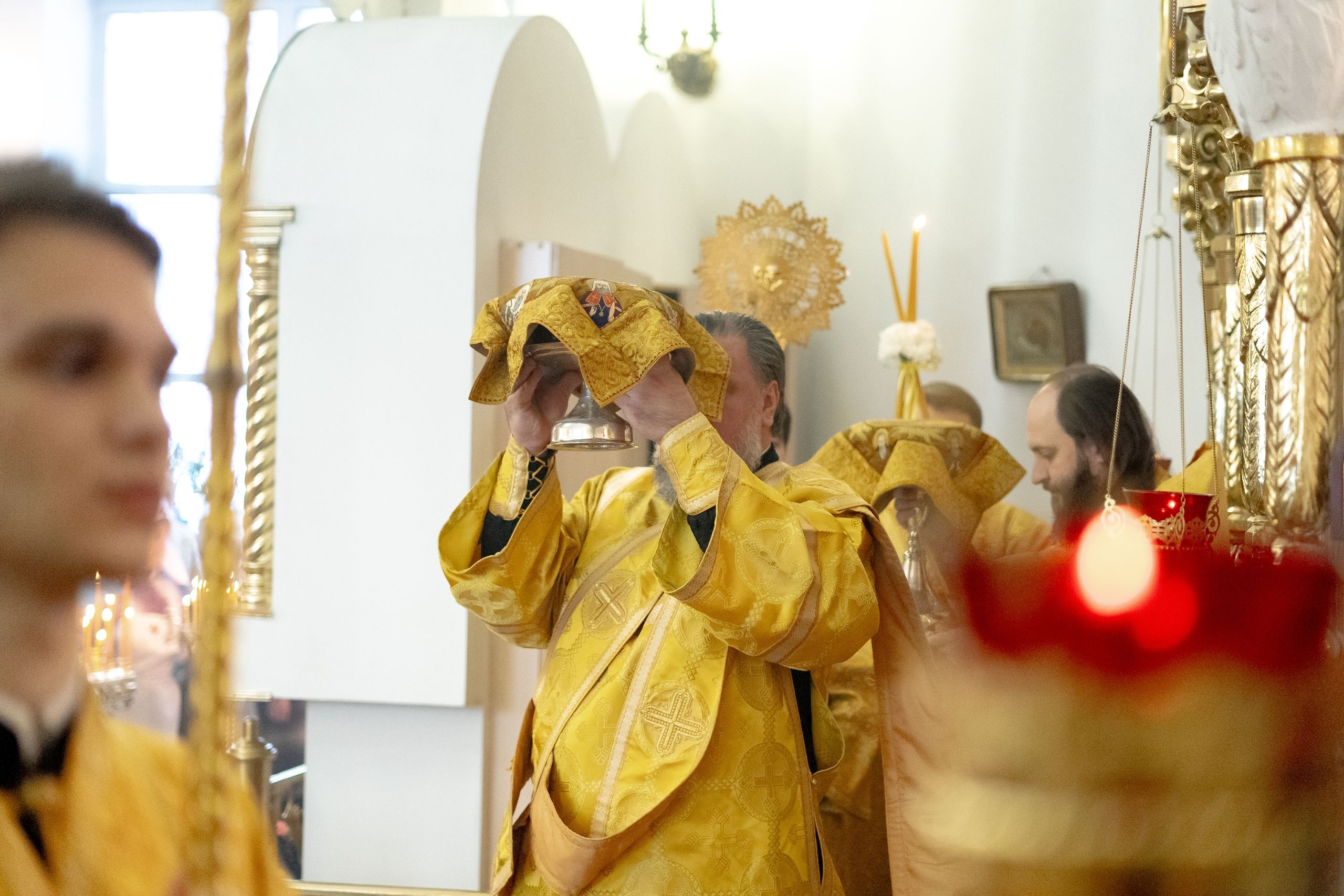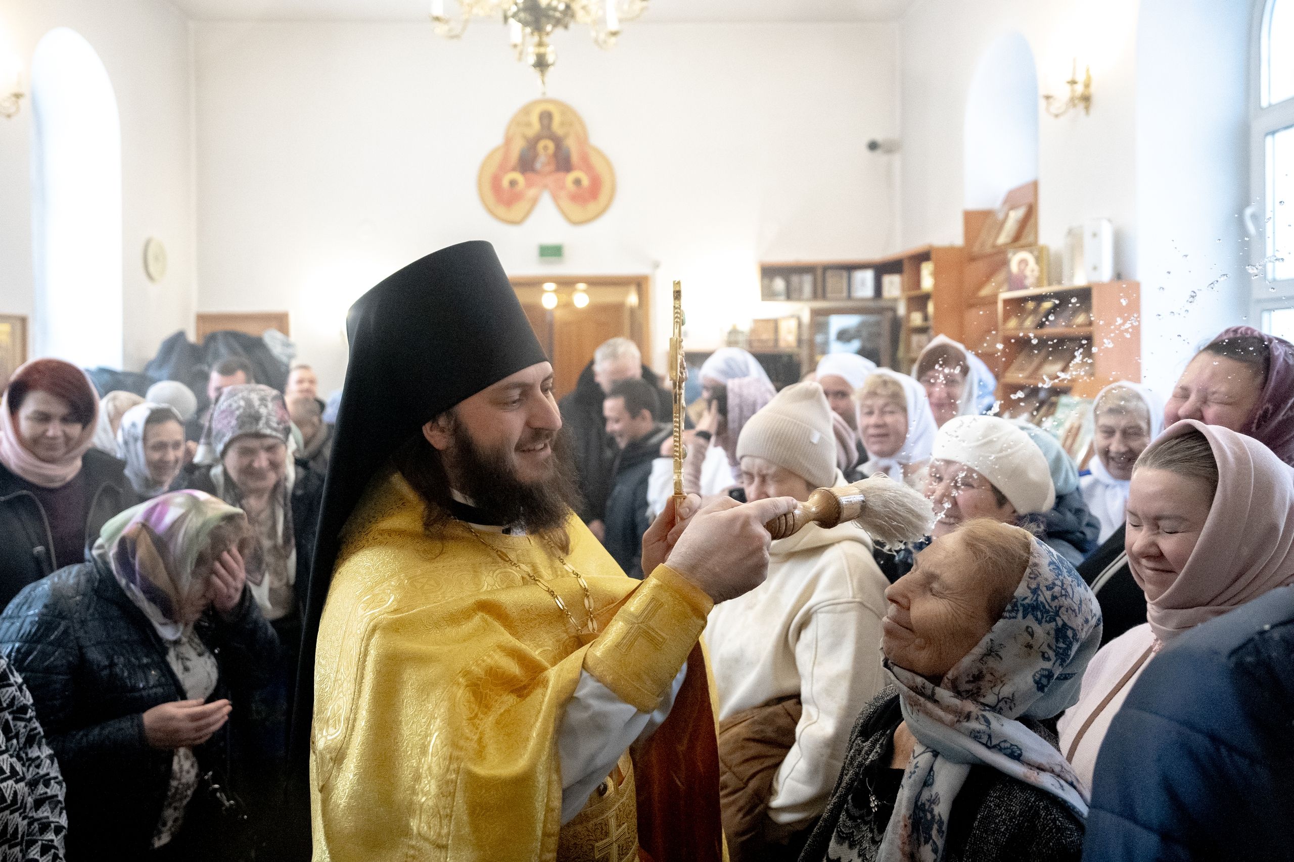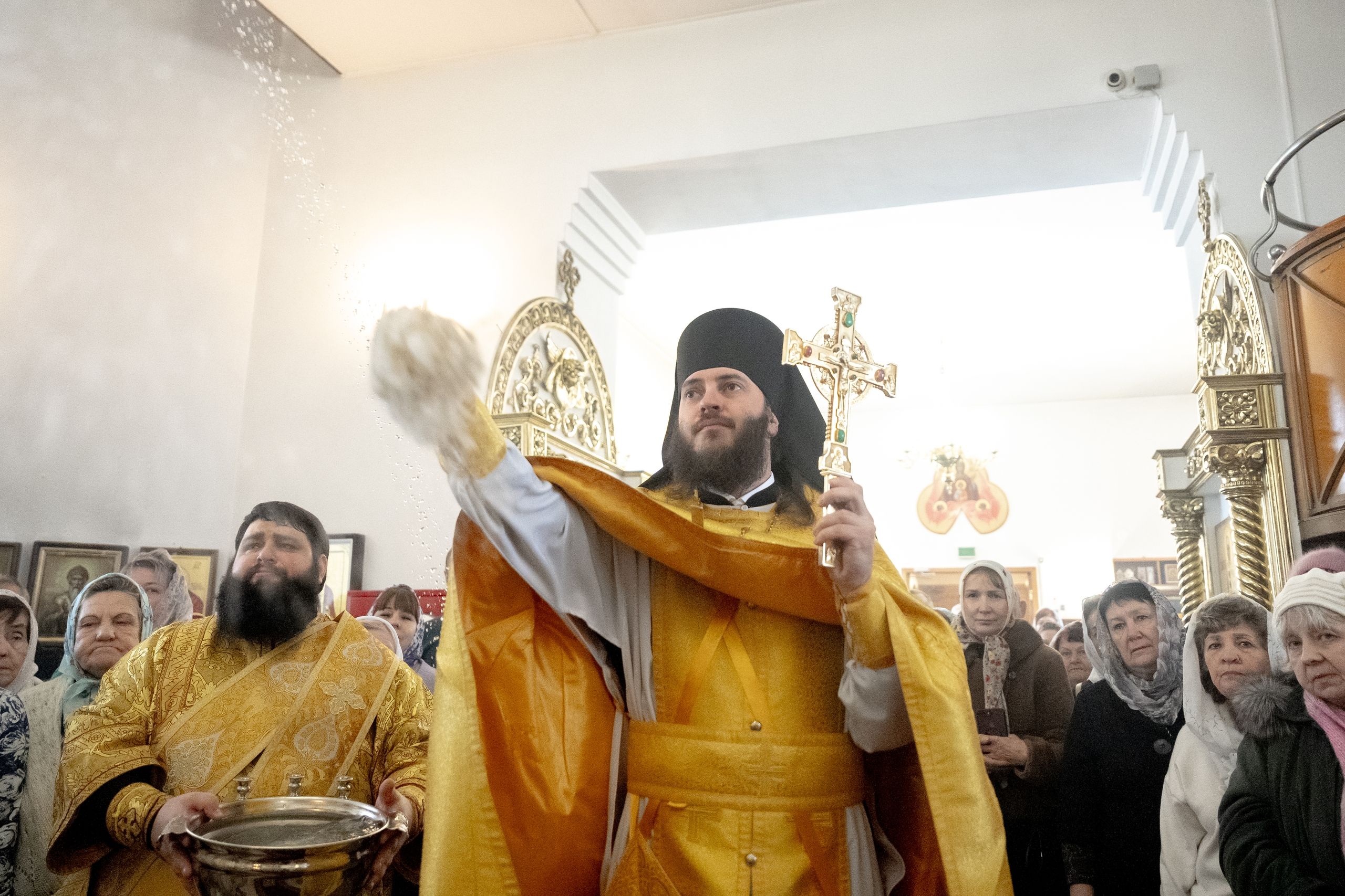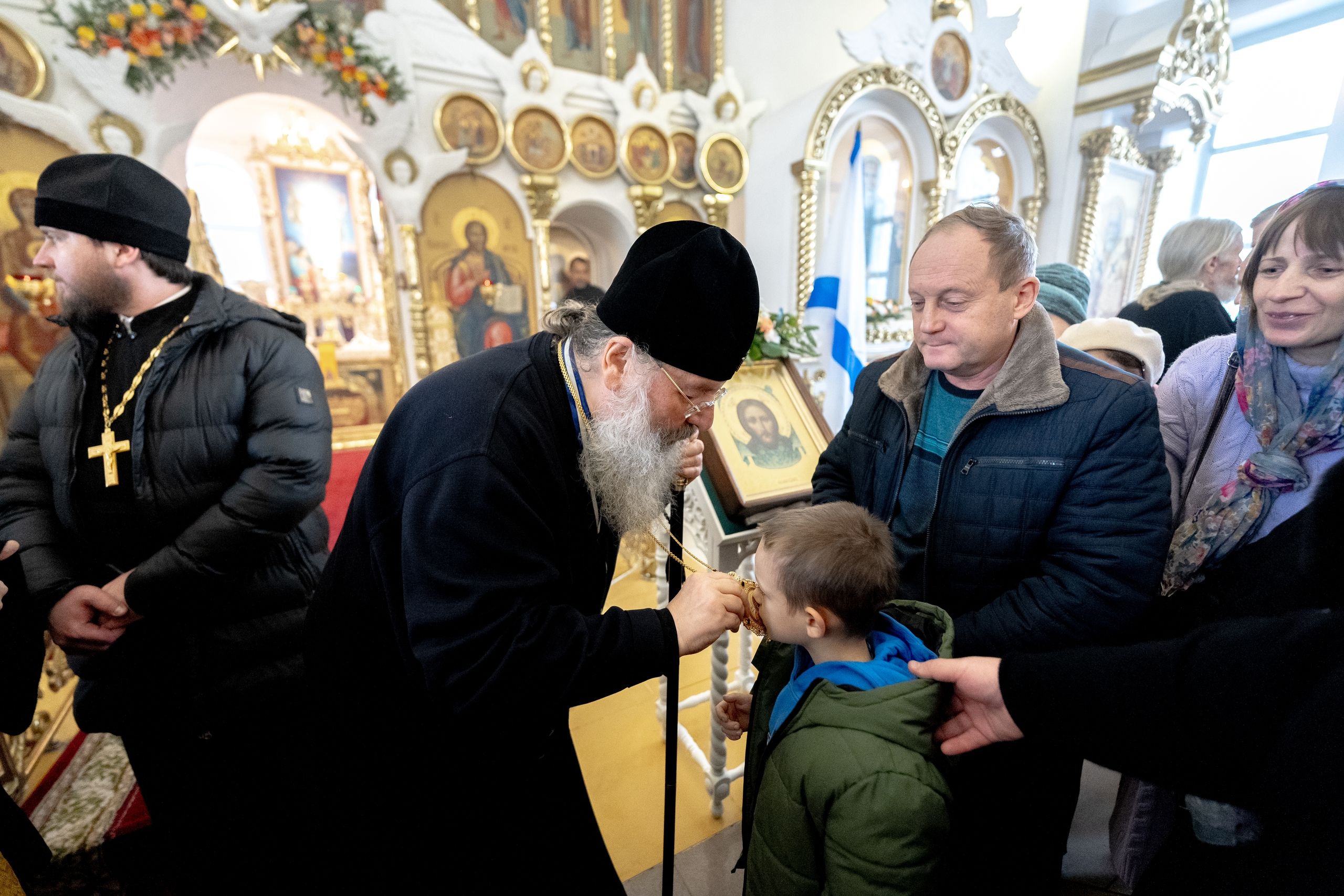 На мирной и сугубой ектениях были вознесены молитвы о Российском воинстве и о мире. По запричастном стихе проповедь произнёс игумен Пимен (Ивентьев).