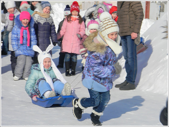 Но Масленица не приходит одна, она привносит в каждый дом любимое блюдо россиян — румяные блины. Послышался топот и игра гармони. Это лошадь с повозкой спешила к детишкам и взрослым с огромными тарелками блинов. Оглянуться не успели, как ребятня окружила повозку. Блины быстро закончились. Пора было спешить в свои дома, к своим близким, чтобы и им передать радость Сырной седмицы!