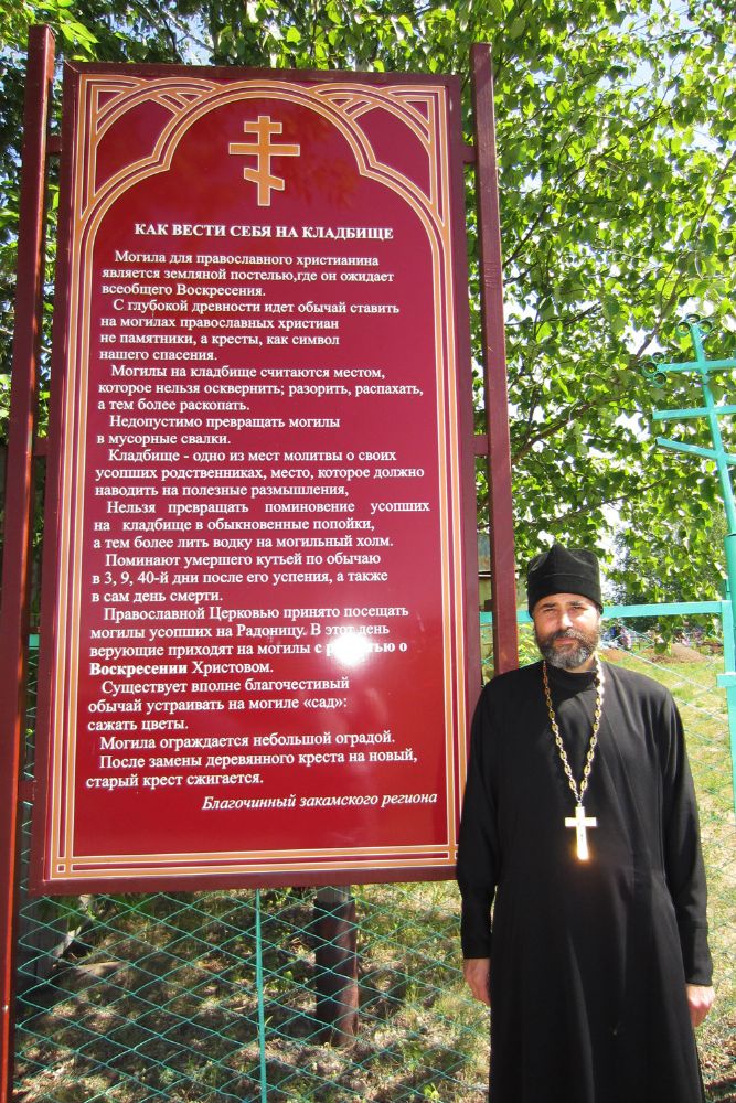 После службы прихожане и настоятель прошли в трапезную, где помянули всех своих родственников за чаем с медом и блинами. После чаепития все вместе поехали на круглопольское кладбище, где была отслужена панихида. Добавим, что накануне настоятелем Михайловского храма был установлен большой стенд с указанием, как себя вести на кладбище.