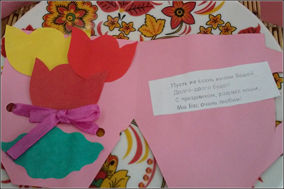 К дню пожилого человека малыши смастерили красивые открытки, которые подарили своим бабушкам и дедушкам.