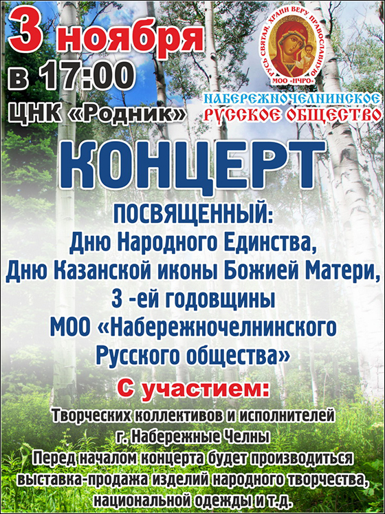 Набережные Челны, 2 ноября — Православное Закамье, Евгения Бальсунова. 4 ноября вся Россия празднует государственный праздник, который нераздельно связан с памятью Казанской иконы Божией Матери, — День народного единства. Специально к этому дню 3 ноября в ЦНК «Родник» пройдет концерт, организованный трудами Набережночелнинского Русского общества, в этом году отмечающего свою третью годовщину.