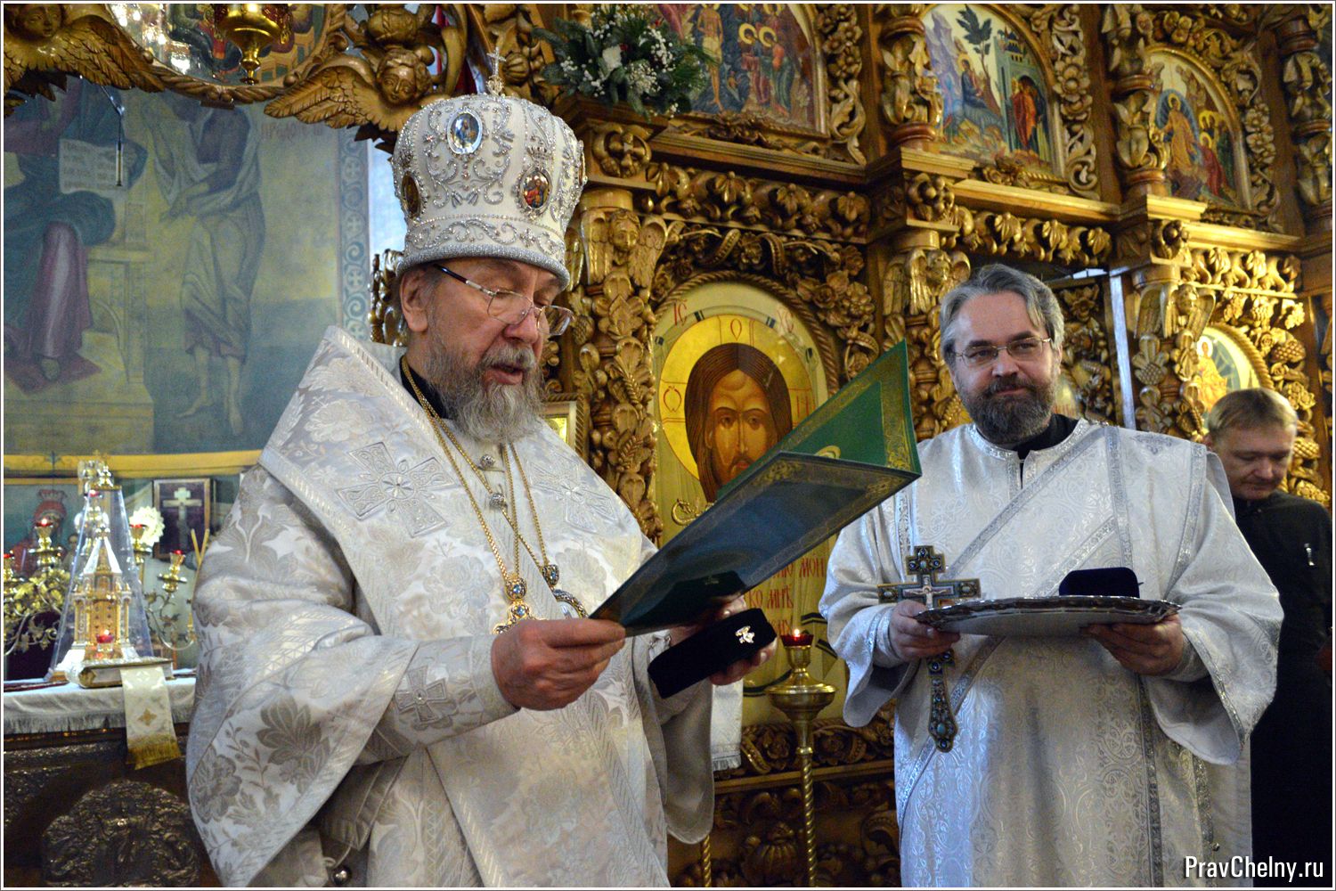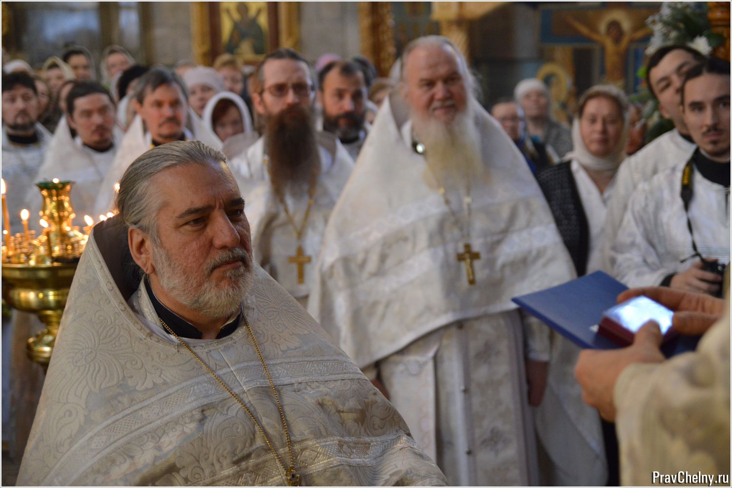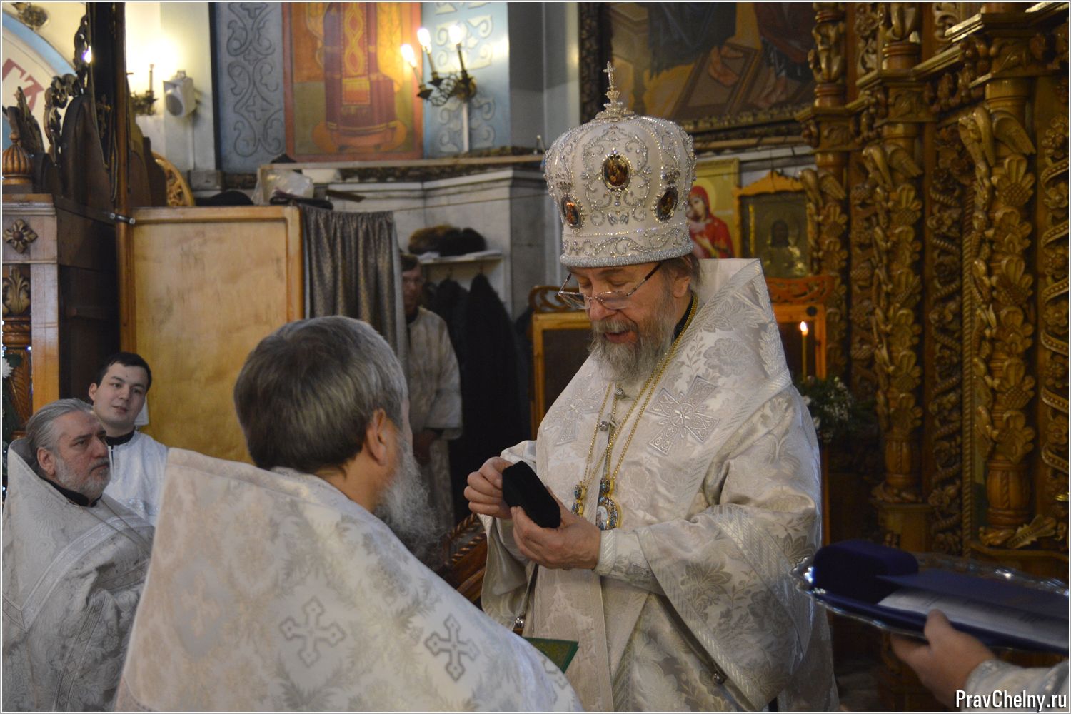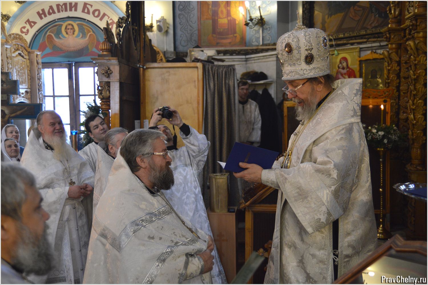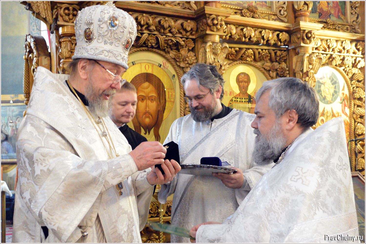 За богослужением в сан протоиерея был возведен настоятель храма прп. Сергия Радонежского города Агрыз отец Андрей Ехлаков; камилавками награждены: клирик Боровецкой церкви иерей Валерий Матвеев, священник прихода Рождества Христова иерей Алексей Носов, настоятель храма села Новотроицкое иерей Александр Щенников; а иерей Владимир Тимофеев, священник Трёхсвятского храма села Ижевка, награждён набедренником.
