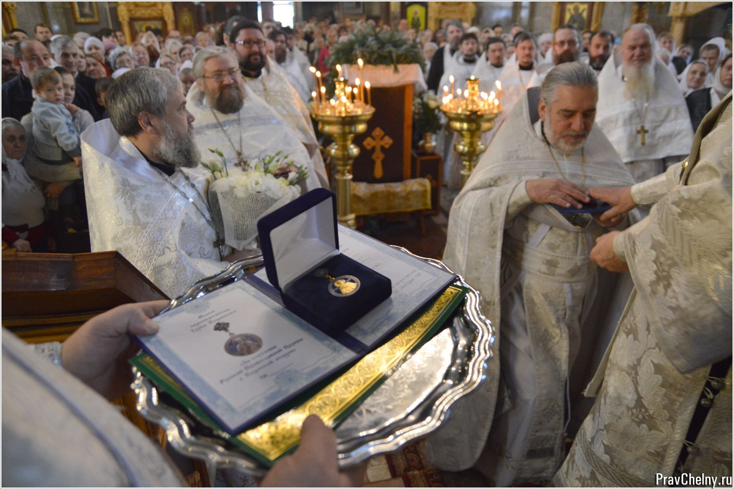 В завершение Литургии архиерей вручил благочинному Закамского региона протоиерею Андрею Дубровину патриарший знак 700-летия прп. Сергия Радонежского, во внимание ко трудам на благо Святой Церкви. Знаком отличия Татарстанской митрополии за церковные заслуги были награждены также протоиерей Олег Богданов, настоятель храма свв. бесср. Космы и Дамиана и протоиерей Михаил Гречко, настоятель храмов прп. Серафима Саровского и свт. Тихона (в пос. Сидоровка). Медалью святителя Гурия Казанского был награжден благотворитель Е.П. Бушуев.