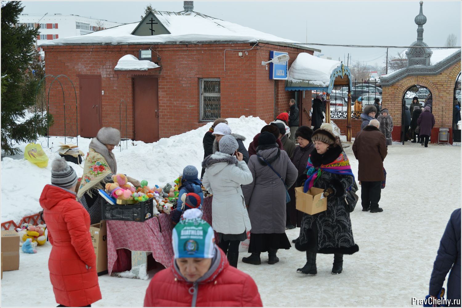 Набережные Челны, 24 января — Православное Закамье, Елена Кораблёва. Во дворе Свято-Вознесенского собора, утром 19 января социальный отдел организовал благотворительную ярмарку. Прихожане нашего храма — и взрослые, и дети — активно помогали в сборе средств на нужды детей-инвалидов, детей-сирот, многодетных семей, одиноких стариков. Высокая ель, украшенная к празднику свт. Николая Чудотворца, раскинула свои лапы над вертепом, укрывая Младенца Христа от снега и радуя Его своими игрушками.