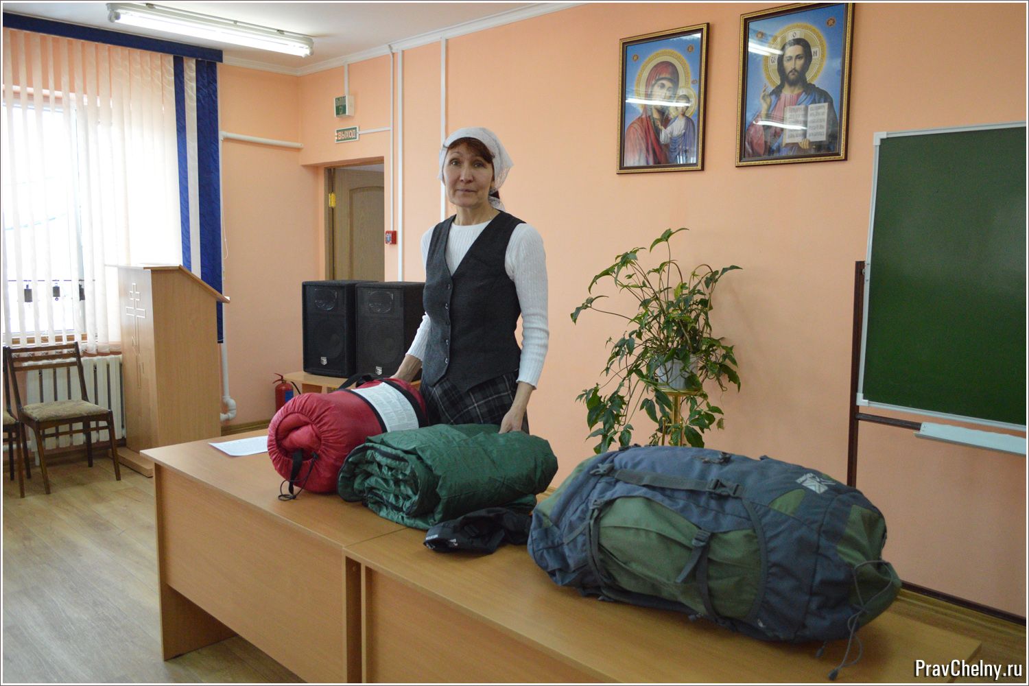 Она объясняла и показывала — какие вещи необходимо приобрести к крестному ходу. Очень важно правильно выбрать рюкзак, лёгкий и тёплый спальный мешок, удобную обувь. Одежда должна быть многослойной и удобной. Нужно научиться правильно упаковывать вещи, брать только самые необходимые предметы, так как в крестном ходе все вещи несут на себе.