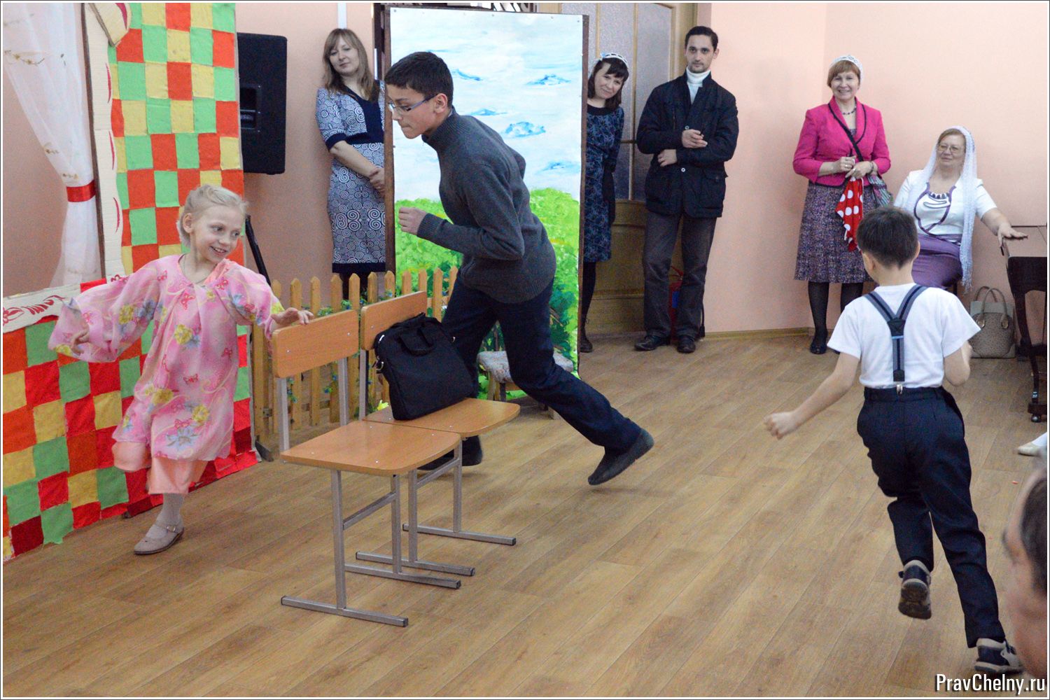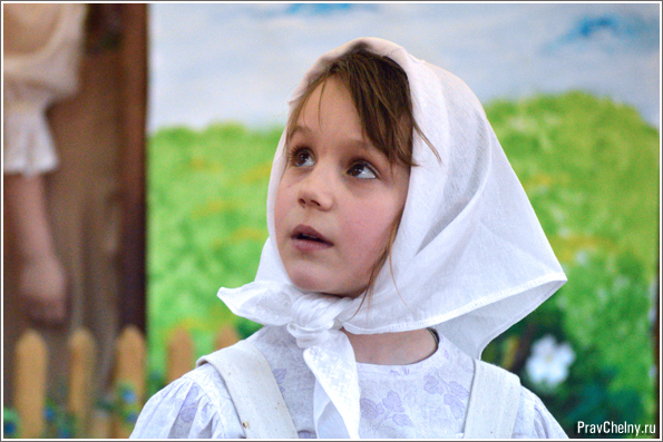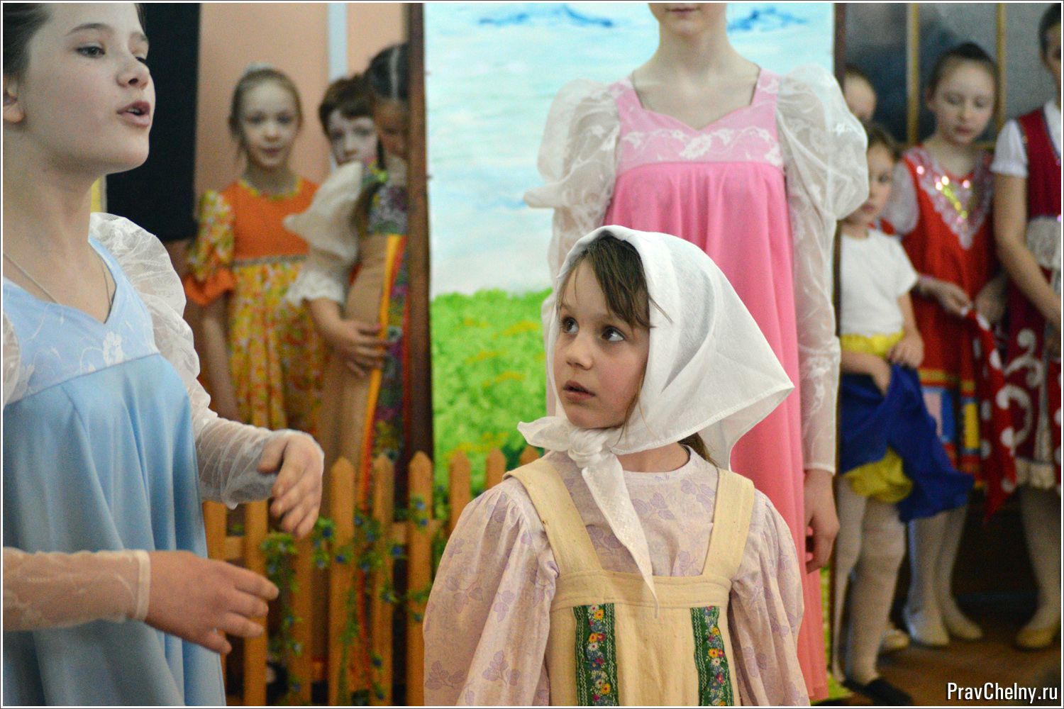 В продолжение пасхальной радости учащимися 7-8 лет группы «Буки» был показан спектакль «Гуси-лебеди». Ребята порадовали зрителей всем знакомой русской народной сказкой про Алёнушку и братца Иванушку. Алёнушка, не послушав наказа родителей, по нерадению, заигравшись с подружками, оставила братца, которого унесли гуси-лебеди.