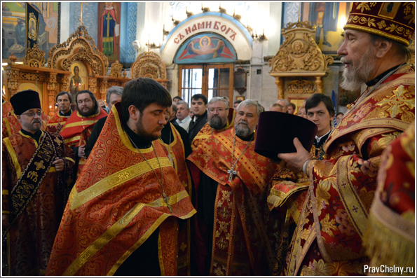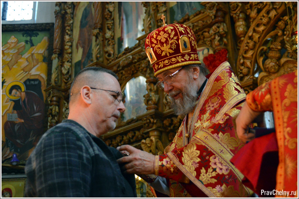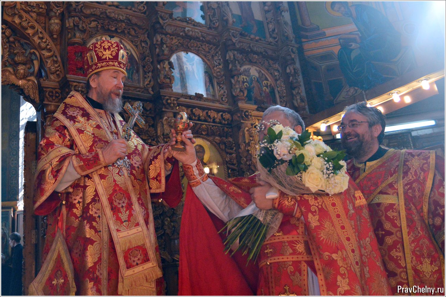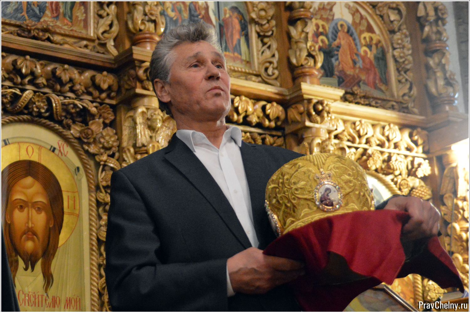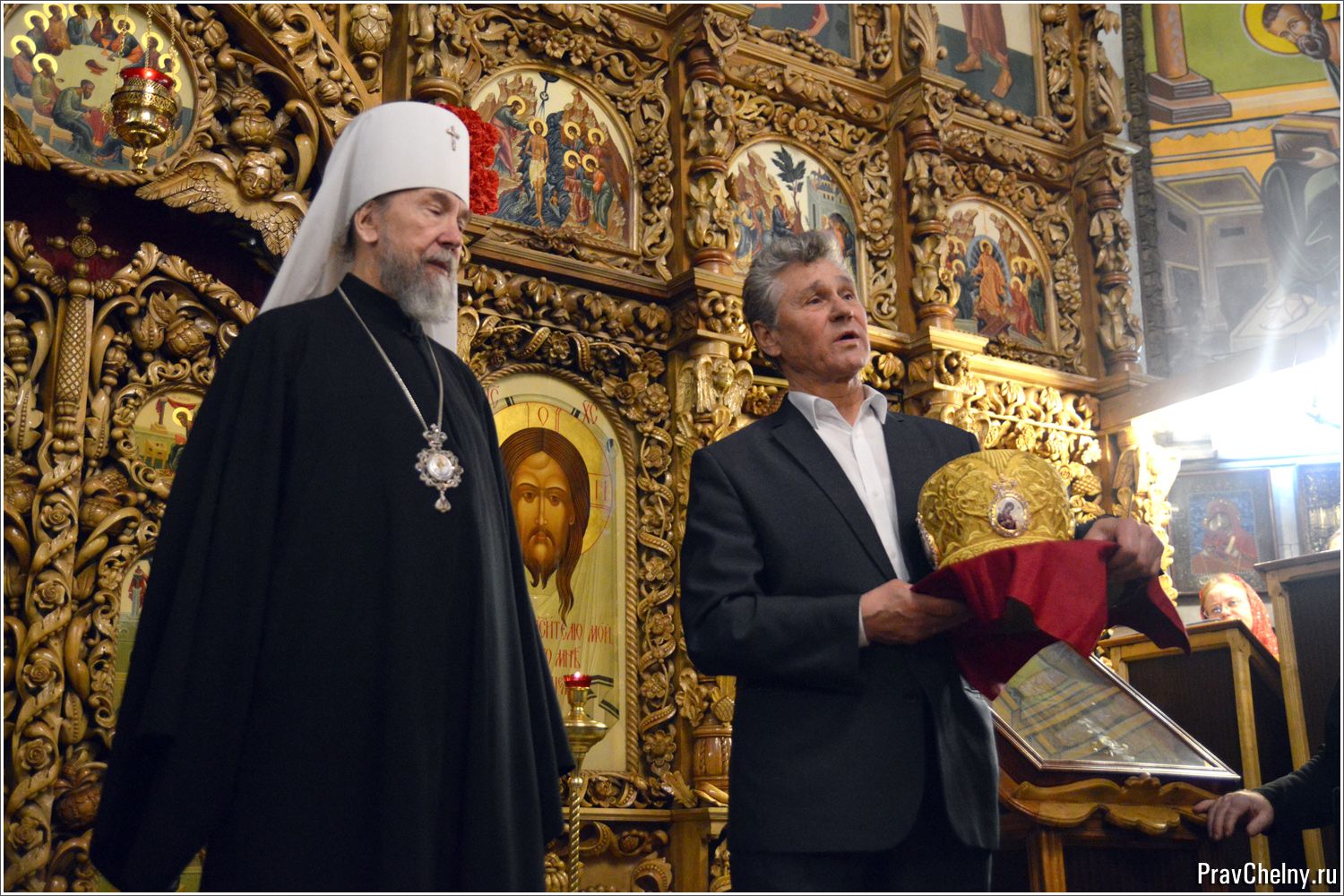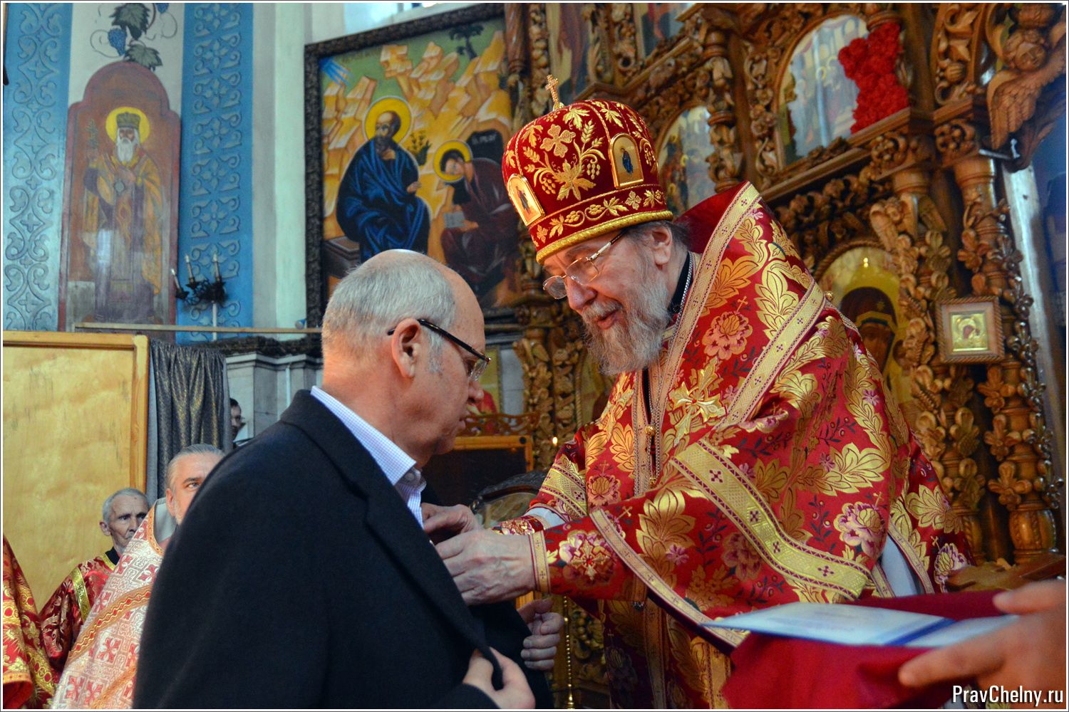 Председатель Попечительского совета православных храмов г. Набережные Челны, заместитель председателя Императорского Православного Палестинского Общества Республики Татарстан Александр Бабаев и действительный член ИППО Елена Дубровина преподнесли митрополиту Анастасию в дар митру от имени Палестинского Общества, от имени духовенства города и всех прихожан. Александр Николаевич пожелал архипастырю Божией милости и крепкого здоровья для служения Господу Богу.