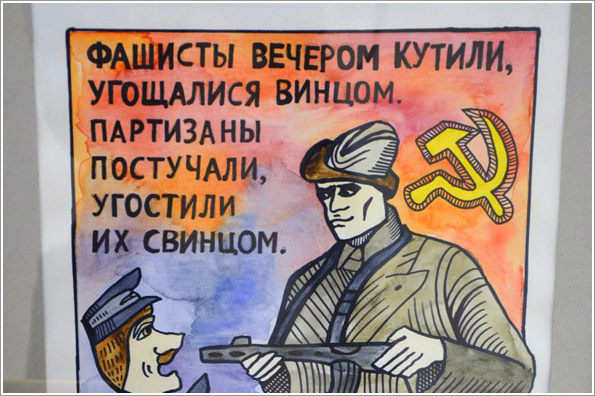 Студенты выполняли работы в забытом жанре «лубок», обратились они к этой старинной технике в рамках учебного курса «Графика». Изначально этот жанр был народным, лубки рисовали целыми деревнями. Рисунки выполнялись в технике ксилографии или гравюры. На листе бумаги делался черно-белый оттиск, который потом раскрашивался в яркие цвета. Сюжетом служила какая-либо острая сатирическая частушка. В этот раз художники обратились к частушкам военного времени, например, таким: «Фашисты вечером кутили, угощалися винцом. Партизаны постучали, угостили их свинцом». В народных частушках высмеивали Гитлера, немецкие войска, прославляли партизан, солдат Красной армии, жен и матерей, ждущих в тылу. Лубки же — это визуализация таких частушек.