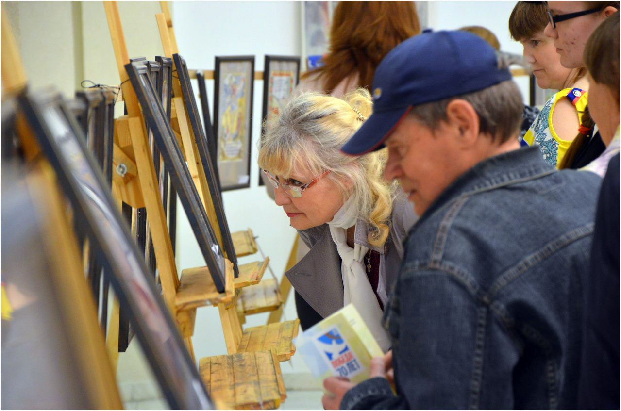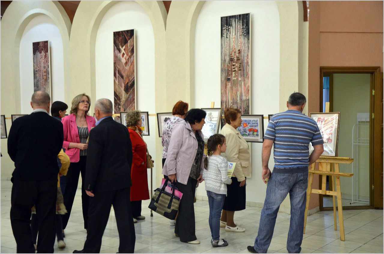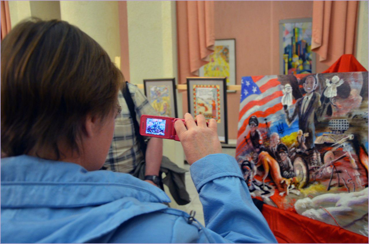 Выставка, расположившаяся в фойе зала, также была посвящена 70-летию Победы. Здесь были представлены работы действительного члена ИППО Юрия Свинина — члена Союза художников, Заслуженного деятеля искусств Республики Татарстан — и его учеников, студентов Камского института искусств и дизайна.