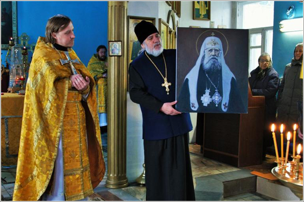 Со словами поздравления обратился к собравшимся настоятель храма преподобного Серафима Саровского протоиерей Михаил Гречко, по случаю престольного праздника преподнес в дар облачения и картину с изображением Святителя Тихона.