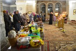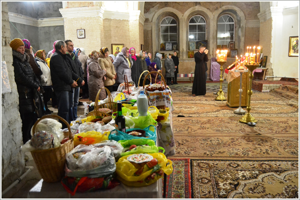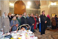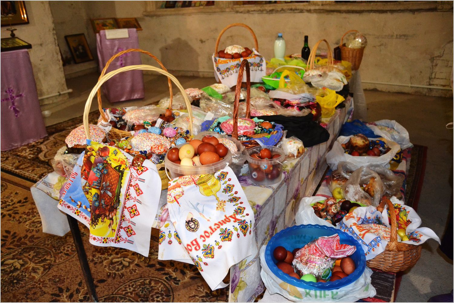 Иерей Дмитрий освятил яйца и куличи, которые принесли верующие в красиво оформленных корзиночках.