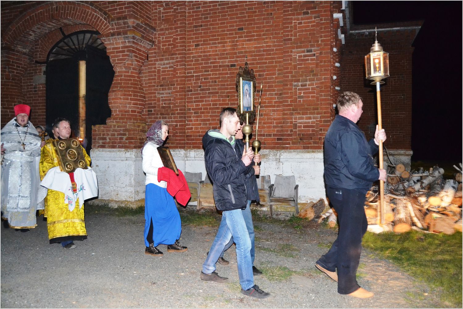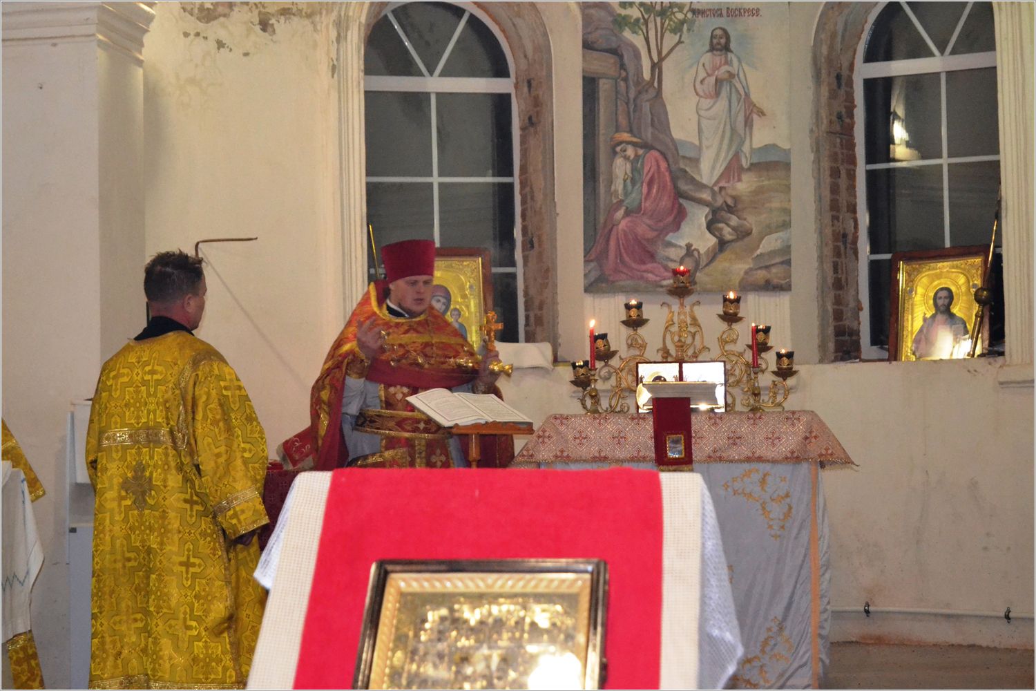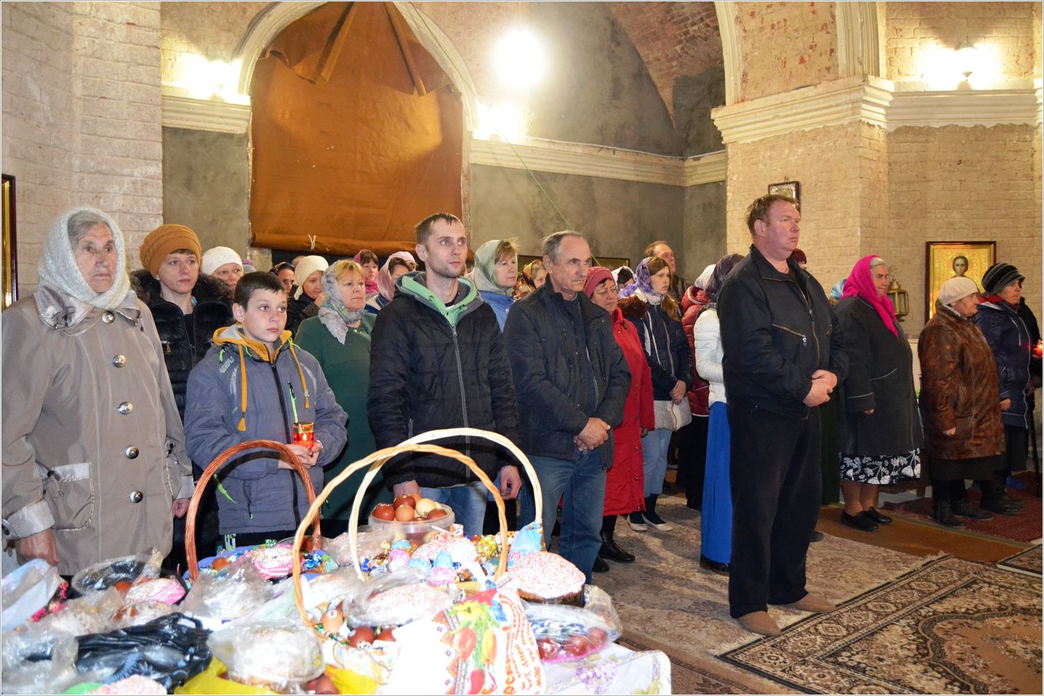 После Крестного хода двери храма открылись — Христос Воскрес и Пасха наступила. Клирик храма святых бессребреников Космы и Дамиана города Набережные Челны иерей Дмитрий Веретнов, возглавивший ночную службу, поздравил всех верующих с великим праздником Пасхи. Затем началось праздничное богослужение, которое продлилось еще несколько часов. Вместе со священником приехал двое алтарников и певчие. Церковное пение в храме никого не оставило равнодушным. Как сказал святитель Иоанн Златоуст: «Ничто так не возвышает и не окрыляет душу, не отрешает ее от земли, не избавляет от уз тела, не располагает любомудрствовать и презирать все житейское, как согласное пение и стройно составленная божественная песнь».