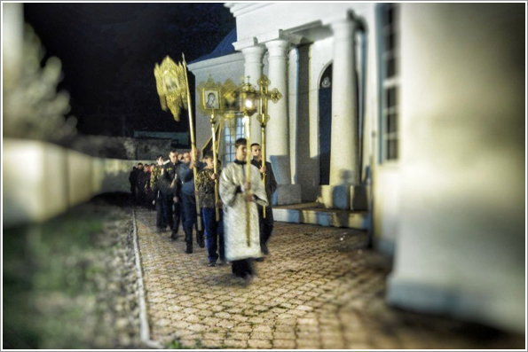 Богослужение началось в 23.00. После Пасхальной полуночницы начался крестный ход. Верующих было настолько много, что пройдя первый круг вокруг храма, пришлось еще ждать у главного входа, пока все люди выйдут. Кстати в соборе заведена традиция ходить крестным ходом три круга. Традицию эту установил бывший настоятель — почивший архимандрит Антоний (Петров). Пройдя крестный ход под звон колоколов, молящиеся встали у дверей храма и с радостью великою запели тропарь Пасхи. Затем началась Божественная литургия.
