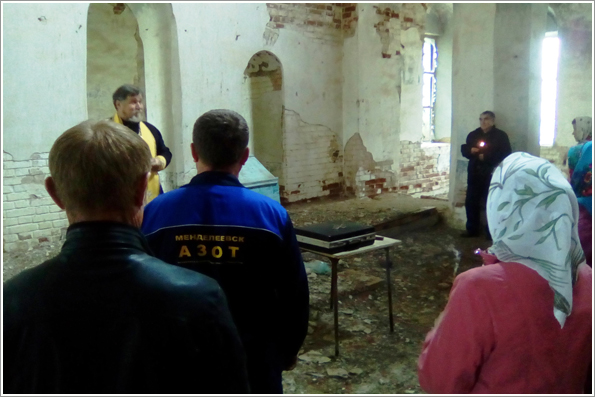 Перед началом собрания отец Виктор Стребков отслужил молебен на начало всякого благого дела. Затем было проведено общее собрание, на котором был выборан староста прихода — Абрамов Николай Васильевич, а также намечен перечень работ на ближайшее время. В первую очередь было решено восстановить окна и кровлю над центральным куполом. А для ускорения процесса разделить храм на две части, и на первом этапе основные работы вести в центральной части, чтобы как можно скорее начать первые службы. Трапезная часть храма и колокольня будут восстановлены позднее.