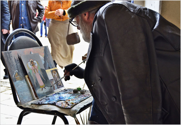 Единогласным решением жюри был определен и победитель в номинации «Образ». Им стала работа «Церковный художник» Анны Низамиевой (г. Набережные Челны). Снимок сделан в Абхазии, которую недавно посетила Анна, у входа в один из храмов, где местный художник рисует незатейливые картинки с изображением ангелов, святых, горных пейзажей, и тут же, в притворе храма, выставляет свои работы — может быть, кто-то захочет увезти с собой на память такое вот воспоминание об этом прекрасном месте.