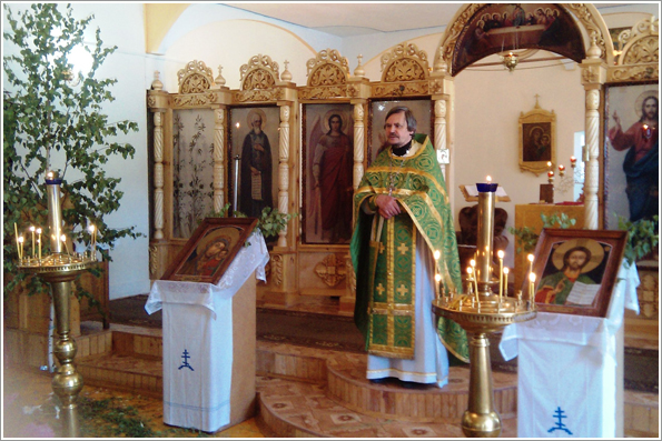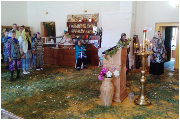 В день Святой Троицы Божественную литургию в сельском храме служил помощник благочинного Закамского округа по религиозному образованию и катехизации иерей Георгий Опарин. После окончания Литургии тотчас была начата вечерня с особыми коленопреклоненными молитвами, которые являются особенностью троицкой службы.