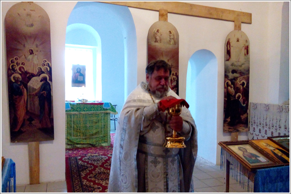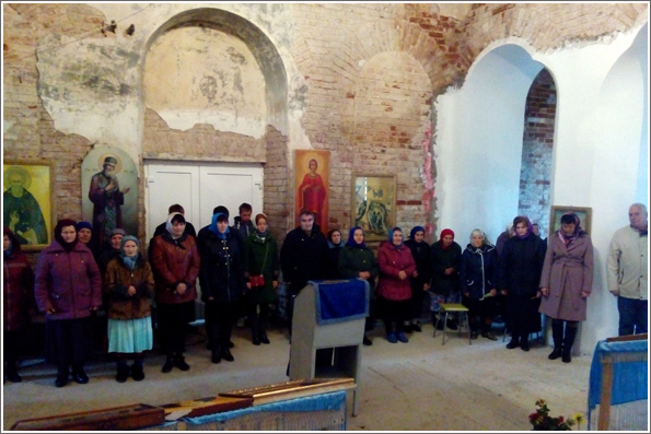 На этот раз Таинство Евхаристии было совершено в обновлённом, заново выкрашенном алтаре этого старинного дома Божия. Службу возглавил настоятель храма села Тихоново протоиерей Виктор Стребков, под чьим руководством здесь и ведутся сельчанами восстановительные работы.