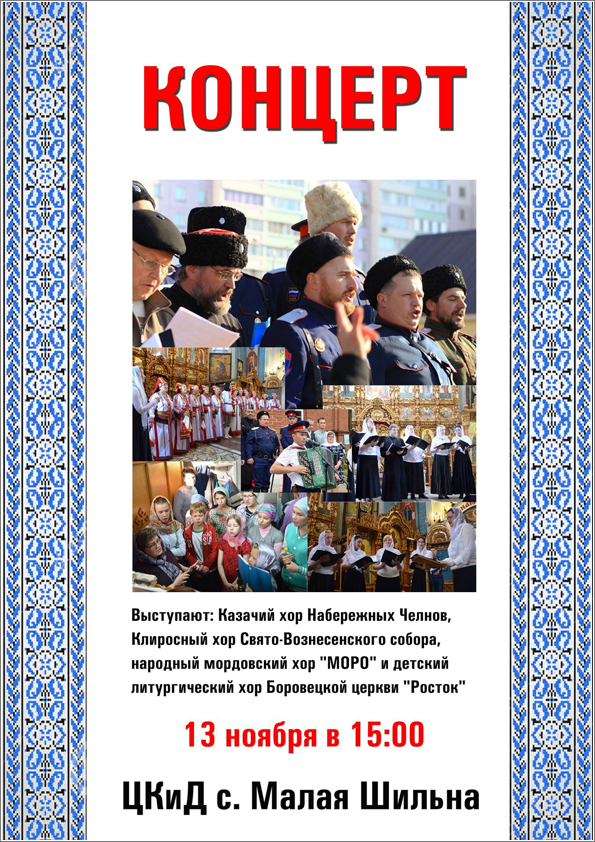 13 ноября в здании дома культуры села Малая Шильна пройдет концерт, на котрром выступят клиросный хор Свято-Вознесенского архиерейского подворья, хор храма свт. Спиридона села Малая Шильна, детский литургический хор «Росток» и казачий хор города Набережные Челны.