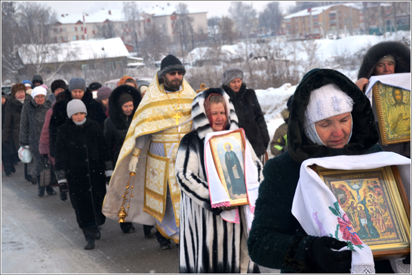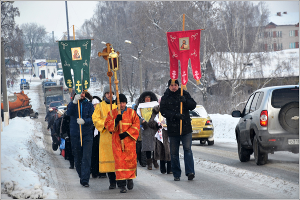 После долгой крещенской службы православные христиане с хоругвями и иконами, с пением праздничного тропаря совершили крестный ход на речку Агрызку.