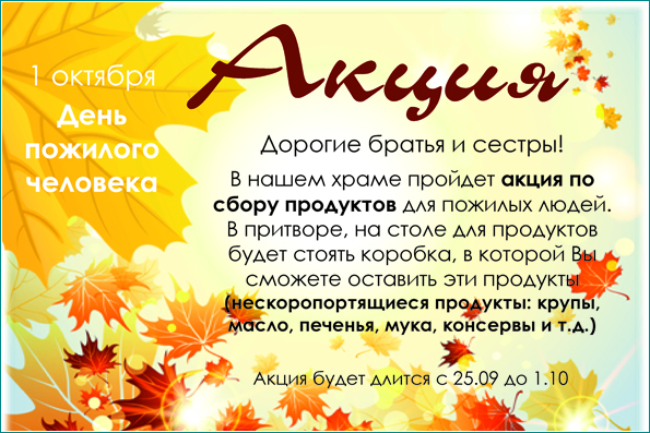 К участию в мероприятии приглашаются все желающие, ведь помощь ближним всегда благословляется Господом. Акция продлится с 25 сентября по 1 октября. Успейте сделать доброе дело!
