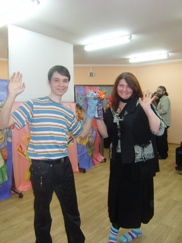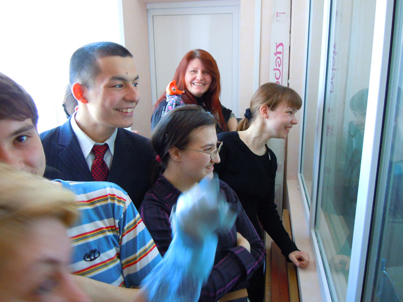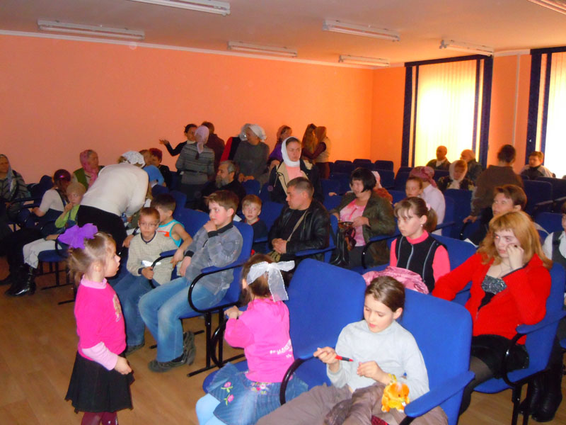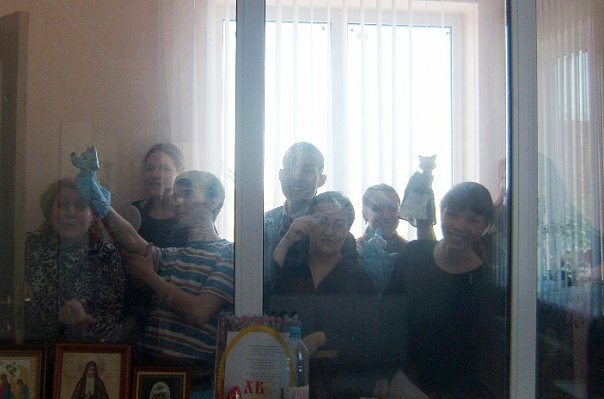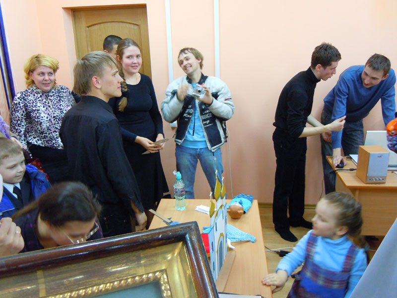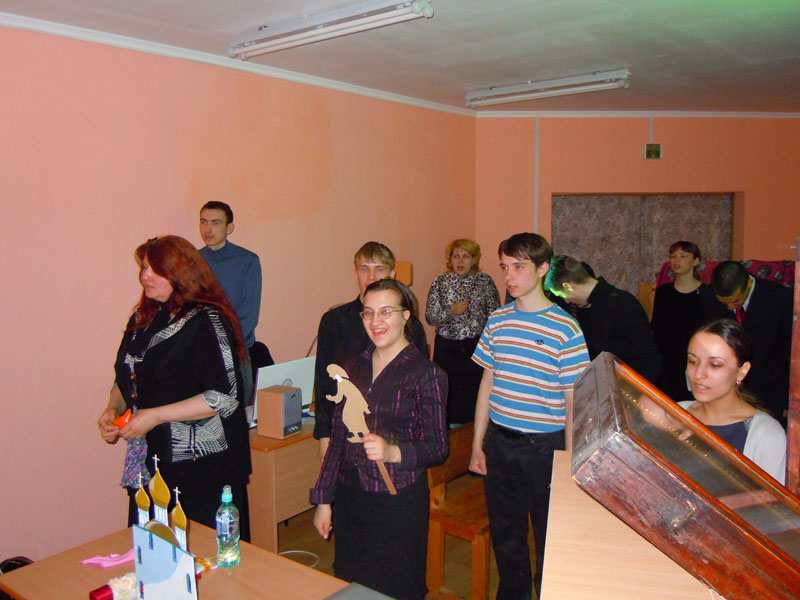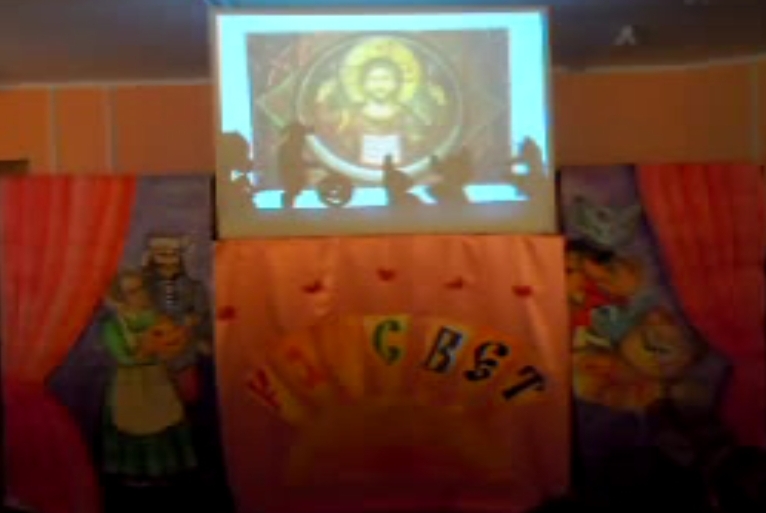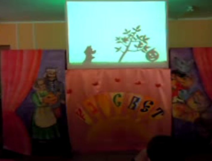 На часах 12.45, с улицы доносится радостные крики детей, в затемненном актовом зале пока только организаторы и главные герои спектакля – лесные звери, колобок, бабка с дедкой, точнее их тени, отраженные на белом натянутом полотне. Чувствуется всеобщее волнение, одно неверное движение героя во время показа может испортить весь замысел. Кто-то предложил помолиться, так и сделали.