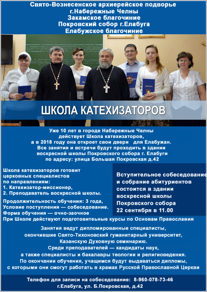 Школа катехизаторов действует уже 10 лет в городе Набережные Челны при Свято-Вознесенском архиерейском подворье. В 2018 году филиал Школы катехизаторов откроется для жителей города Елабуга.