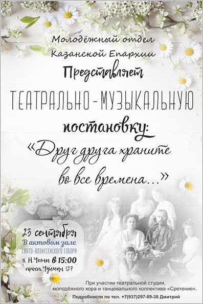 В воскресенье, 15 июля, в музее истории Казанской иконы Божией Матери состоялась премьера театрально-музыкальной постановки «Друг друга храните во все времена…», подготовленной молодежным отделом Казанской епархии.