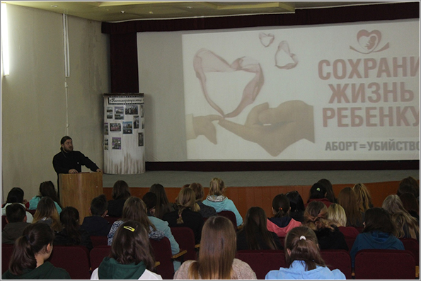 Настоятель Никольского собора иерей Роман Храмутичев рассказал студентам о духовных причинах жизненных ошибок, о нравственных основах семьи и проблеме прерывания беременности с духовной точки зрения. Священник призвал студентов внимательно относиться к жизненному выбору, и искать правильный путь с опорой на веру.