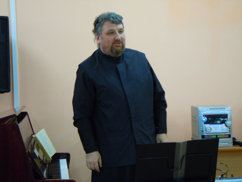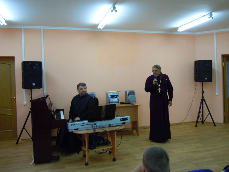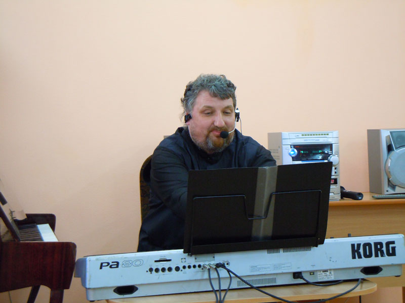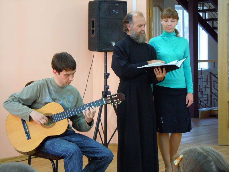 Во второй части концерта перед собравшимися в зале выступили клирики храмов нашего города: иерей Василий Федосеев и диакон Евгений Ступицкий. Иерей Василий под музыкальный аккомпанемент диакона Евгения исполнил три романса. Затем отец диакон исполнил фортепианное попурри из песен военных лет. Зал с первых нот начал подпевать песням знакомым многим с детства. В исполнении отца Евгения прозвучало еще ряд песен. Под занавес концерта была исполнена фортепианная импровизация на мелодию, которую отец диакон попросил сочинить зрителей.