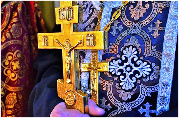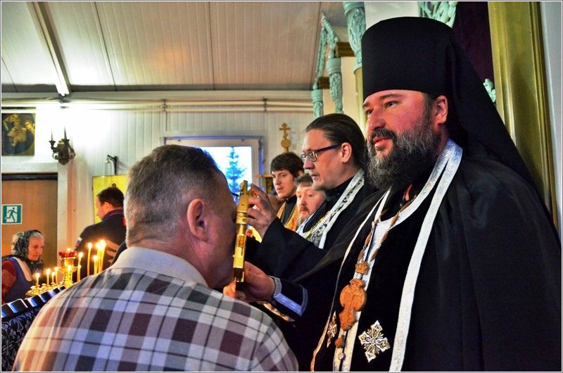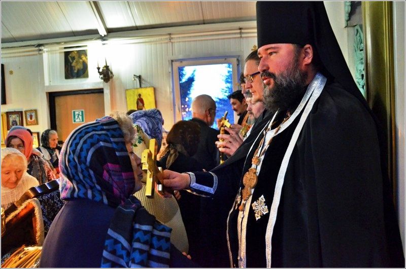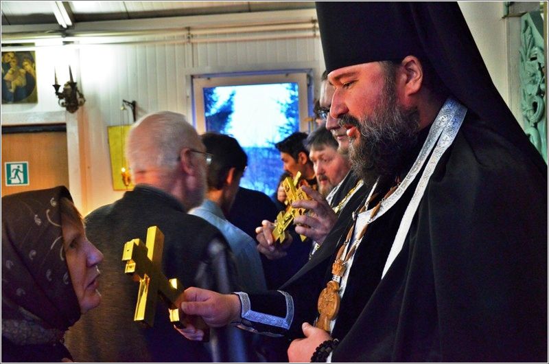 В завершении вечерни, настоятель обратился к молящимся со словом, напутствуя на прохождение подвигов Великого поста и преподал для лобзания Честной Крест.