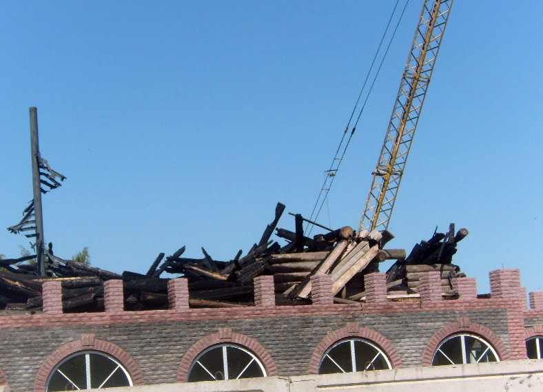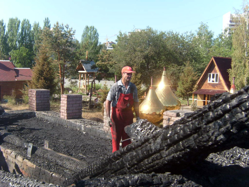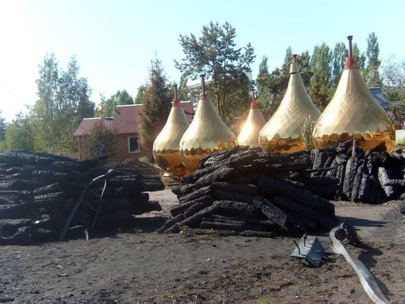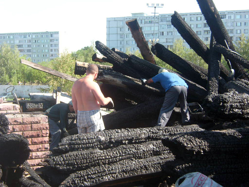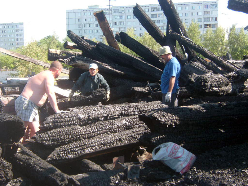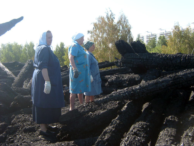 Масштабы пожара видны невооруженным глазом, рядом с лежащими на земле блестящими куполами на оставшемся кирпичном первом этаже повсюду груда обгоревших черных бревен. На лицах работников проглядывается грусть, скрыть такую потерю не по силам даже мужчинам, у них же здесь самая тяжелая работа, женщины разносят мелкие остатки дерева, помогают в трапезной, за уборку берутся даже дети – так с утра и до позднего вечера. «Один пятилетний мальчик даже работал наравне с взрослыми», - рассказала мне одна из работниц.