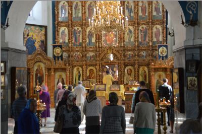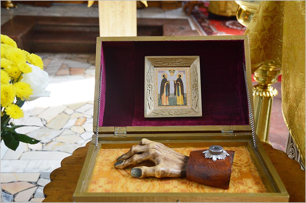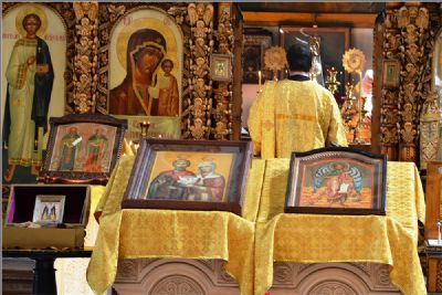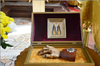 Специально на вечернее богослужение накануне, и в сам день праздника, в собор был привезен ковчег с частицей мощей святых.