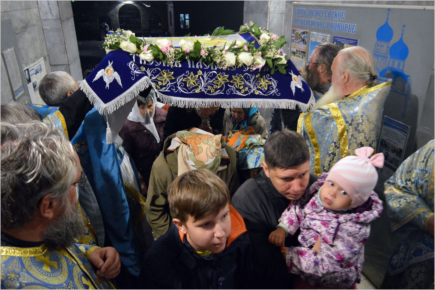 Согласно этой благочестивой церковной традиции, пришедшей на Русь из Иерусалима, во время вечернего богослужения Погребения Девы Марии на середине храма перед праздничной плащаницей священнослужители прочли 17 кафизму Псалтири, перемежая её стихи со стихами особых Похвал Царице Небесной, в которых воспевается жизнь и величие окончания земного пути Той, через Кого в мир вошёл Спаситель.