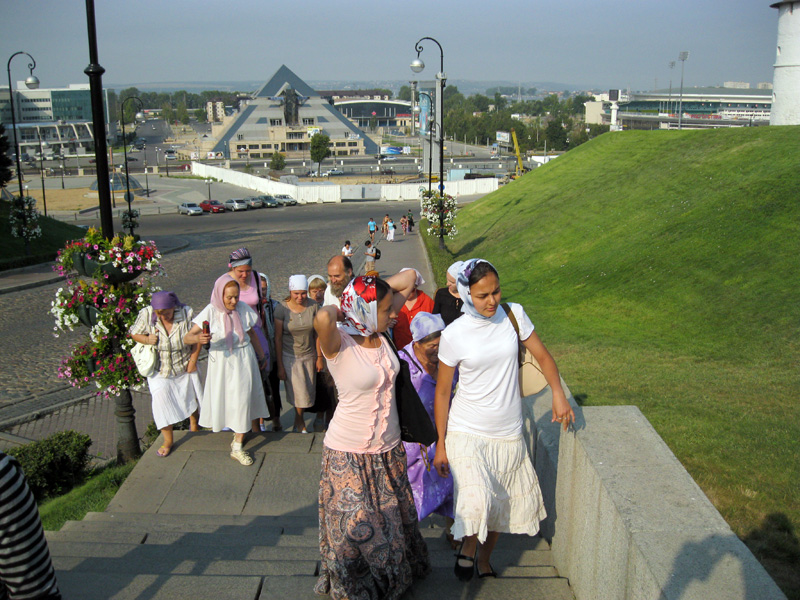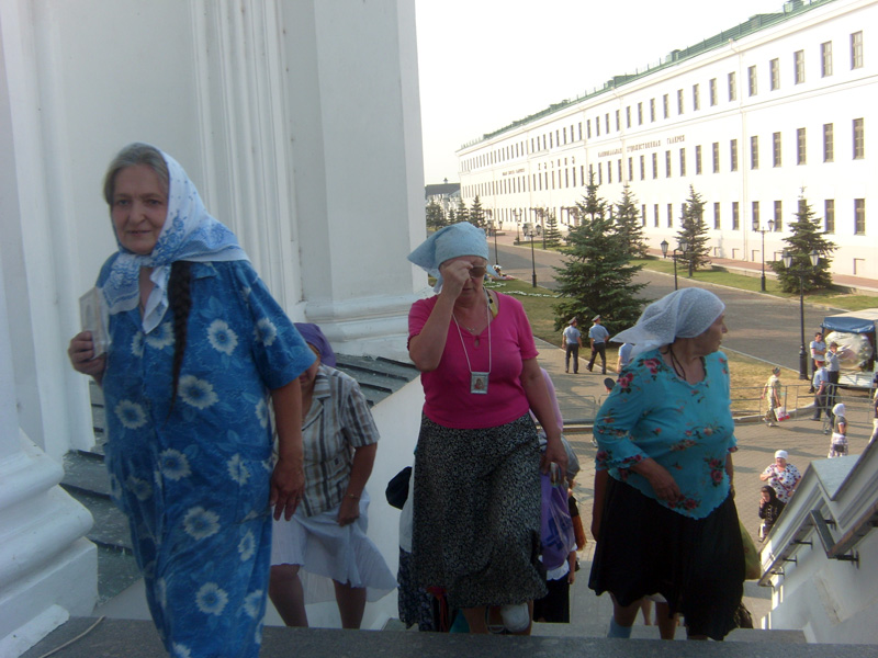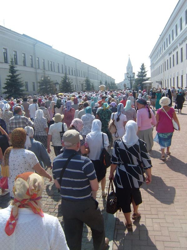 Как и планировали, автобус прибыл к Благовещенскому собору Казанского кремля за полчаса до начала Литургии, еще было время приложиться к Казанской иконе Божьей Матери, подать записки. Но таких верующих в храме помимо челнинцев было не мало, потому многие не успели подойти к иконе. Подступы к Благовещенскому собору охранялись нарядами милиции, рядом были машины скорой помощи. После Литургии, которую возглавил архиепископ Казанский и Татарстанский Анастасий, огромная толпа верующих с «Ватиканским» списком Казанской иконы Божией Матери направилась к Крестовоздвиженскому храму Богородицкого монастыря, по улицам Кремлевская, Чернышевского, Дзержинского, Япеева, Большая Красная. Движение автомобильного транспорта по проезжей части маршрута Крестного хода было перекрыто.